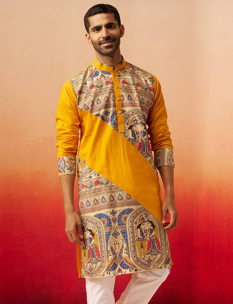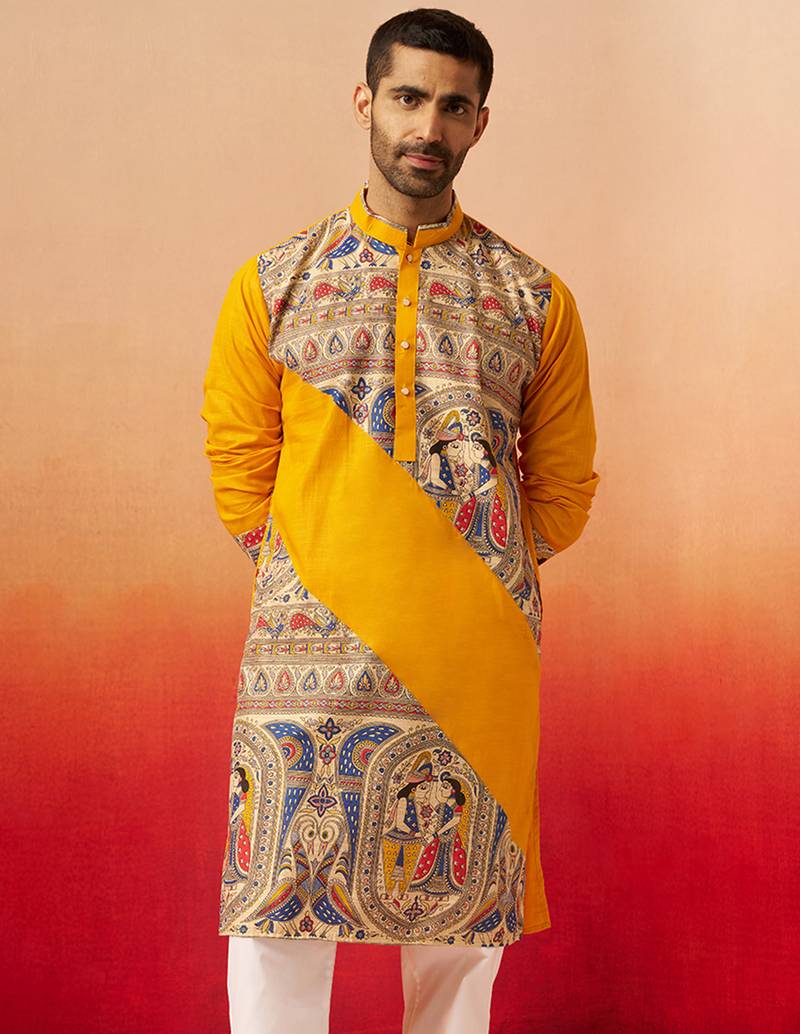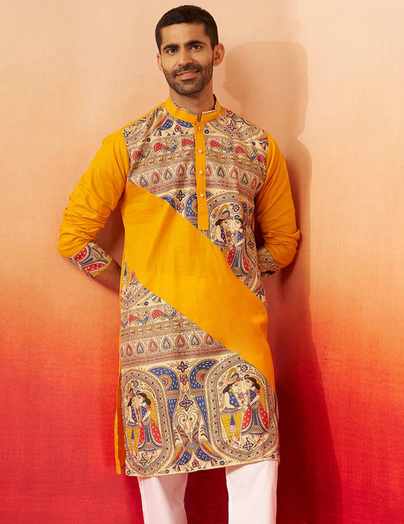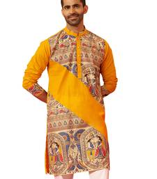 Men yellow cotton digital print kurta - premium figures print festive traditional wear