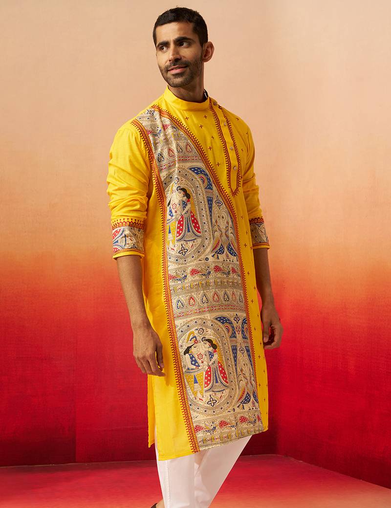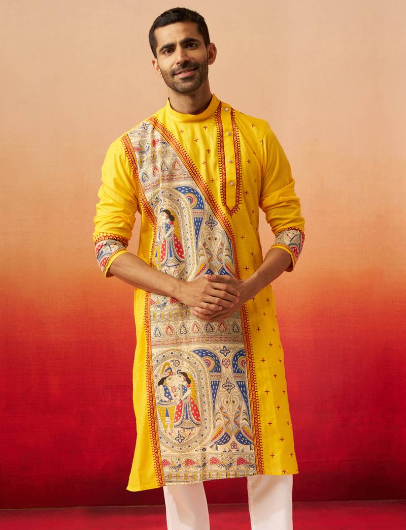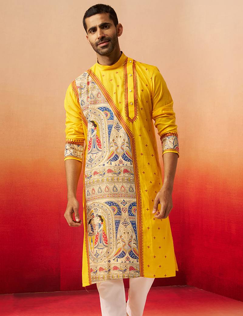 Product Name | Men Yellow Cotton High Neck Digital Print Kurta Premium Geometric Embroidered Festive Wear | |