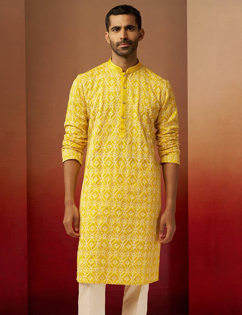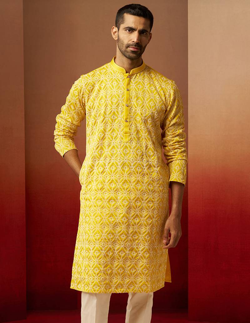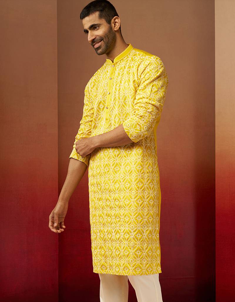 Product Name | Men Yellow Linen Silk Thread Embroidered Kurta Premium Geometric Wedding Festive Wear | |