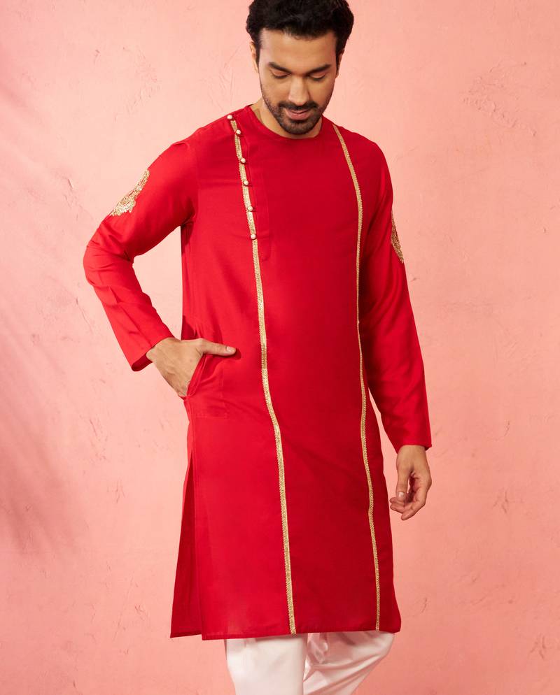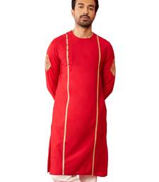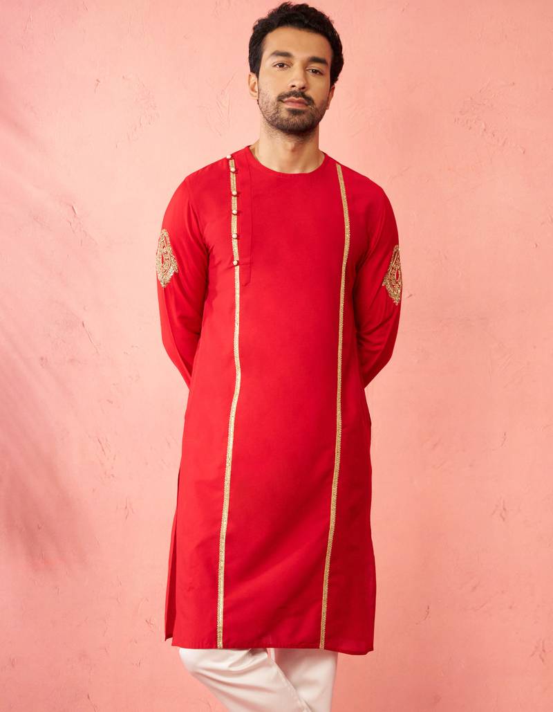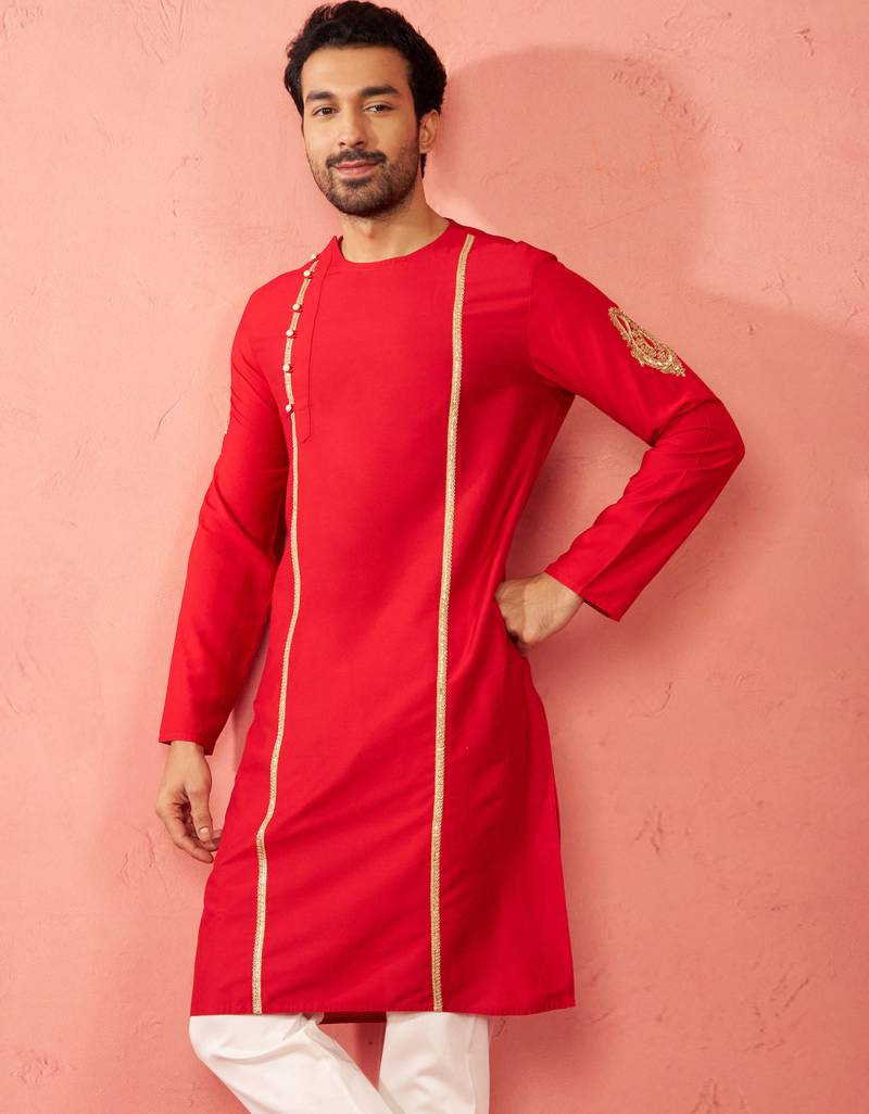 Mens red zardozi embroidered viscose kurta - navratri festive wear