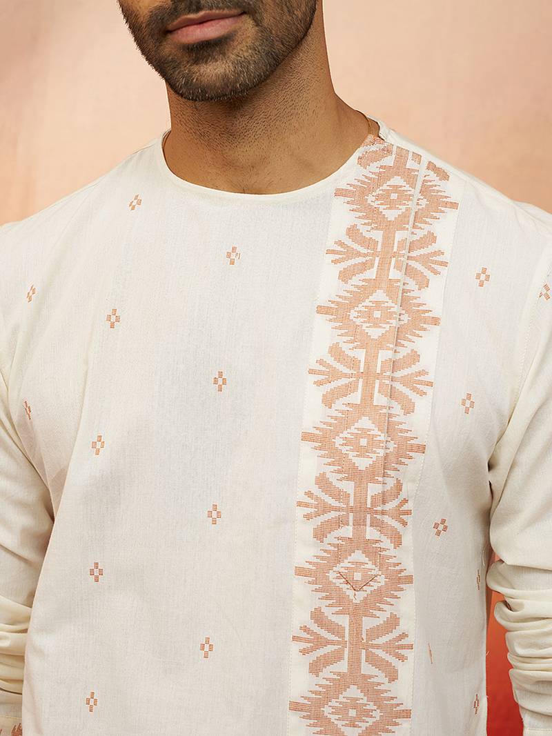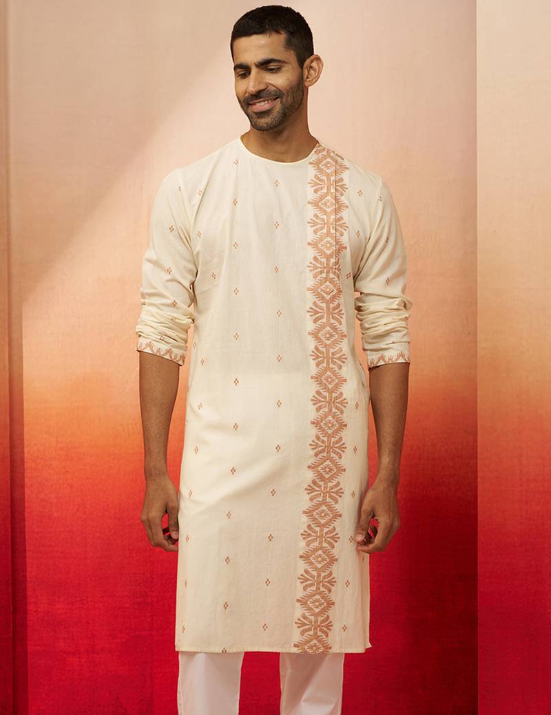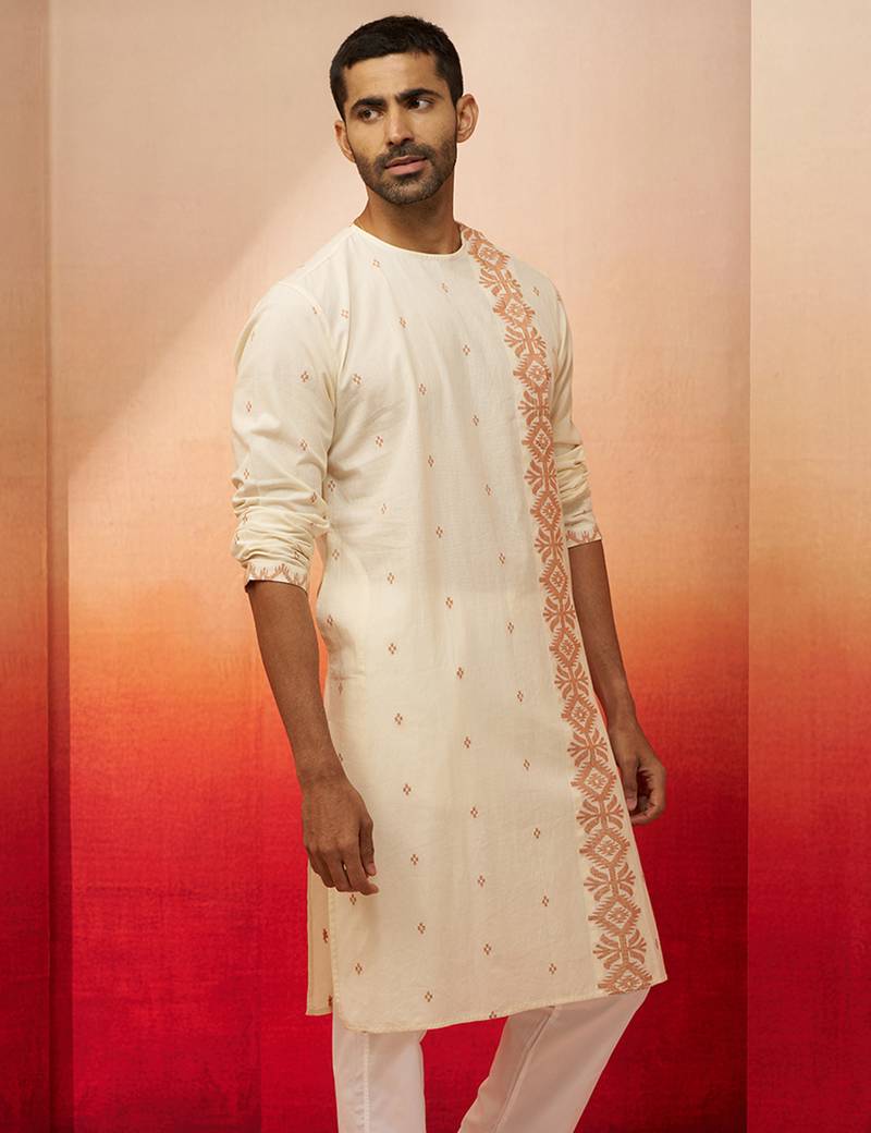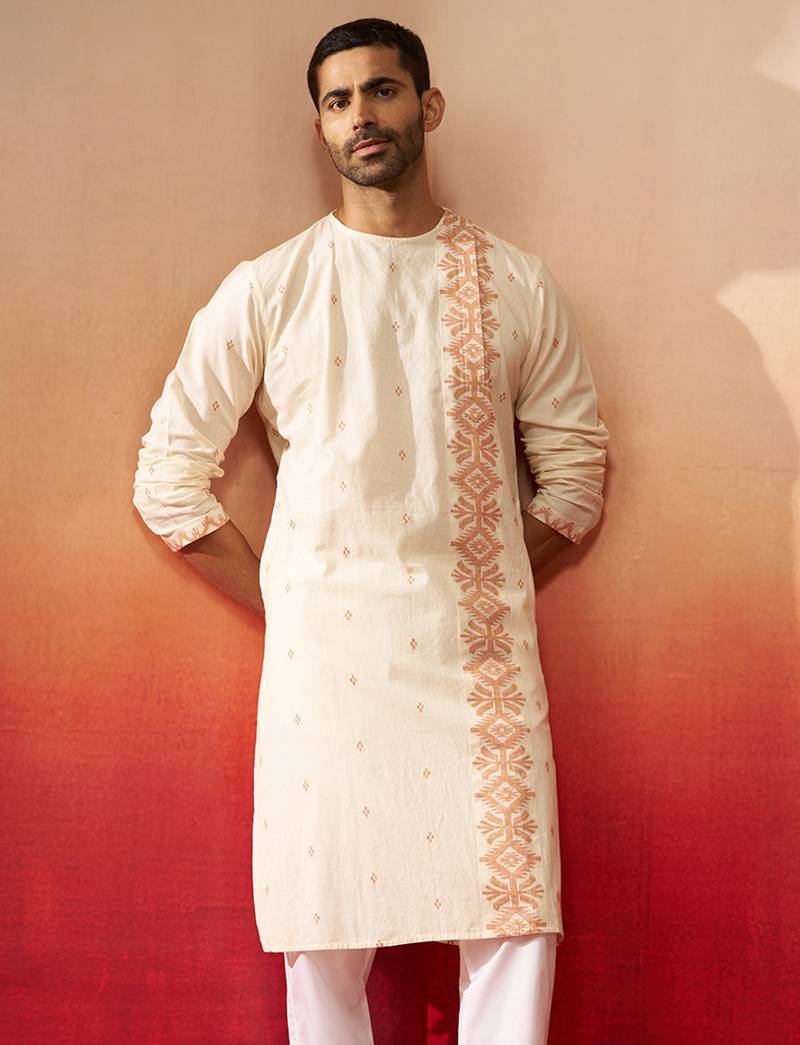 Product Name | Mens White Rust Cotton Jamdani Kurta Navratri Handwoven Traditional Wear | |