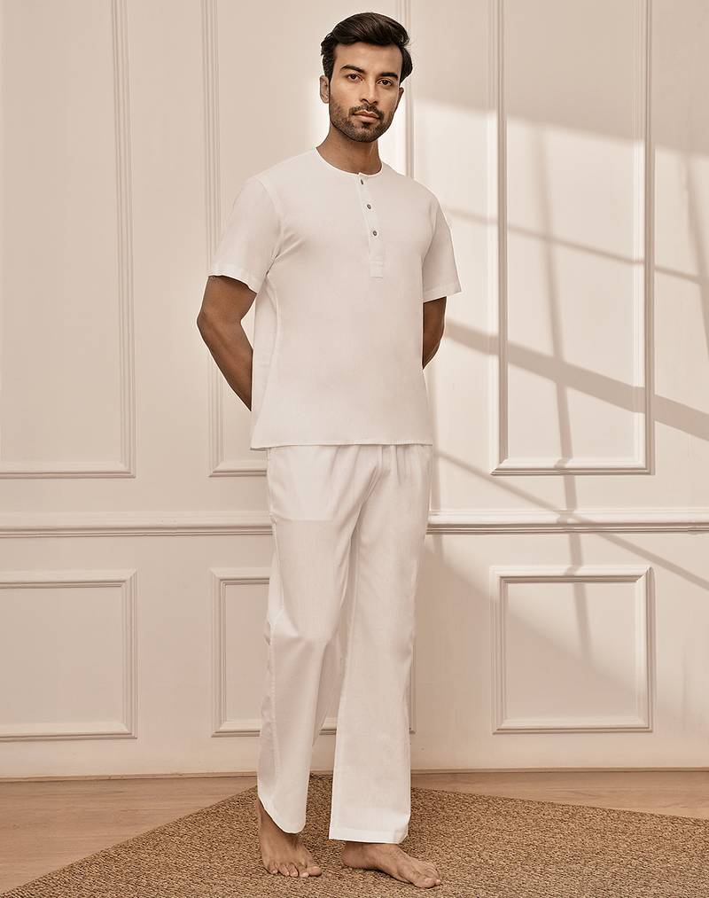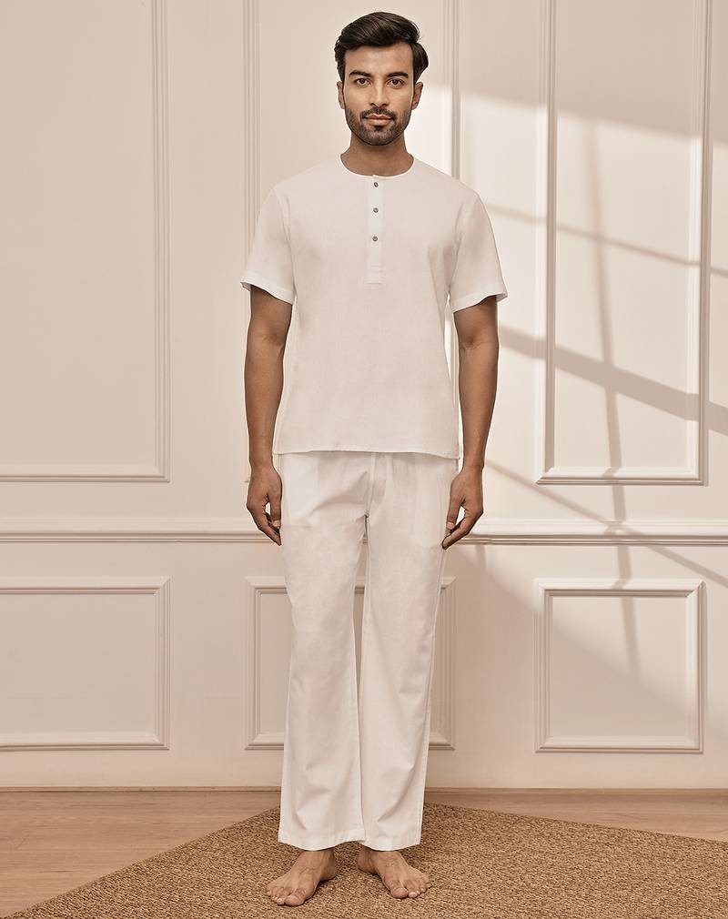 | Product Description | Experience Pure Serenity With Vastramay's Mens White Cotton Kurta And Palazzo Set From The Premium Yoga Collection. Meticulously Crafted In Breathable Cotton Flex, This Set Embodies Mindful Elegance. The Kurta Features A Classic Round Neckline, Comfortable Half Sleeves, And Delicate Thread Embroidery On The Back For Subtle Sophistication. The Matching Palazzo Pants Offer A Full Elasticated Waist And Convenient Side Inseam Pockets, Ensuring Perfect Ease Of Movement. Whether For Yoga Practice, Meditation Sessions, Or Relaxed Weekends, This Set Delivers Mindful Elegance. Its Clean Silhouette And Premium Soft Fabric Make It An Essential Addition To Any Modern Man's Ethnic Wardrobe. | |