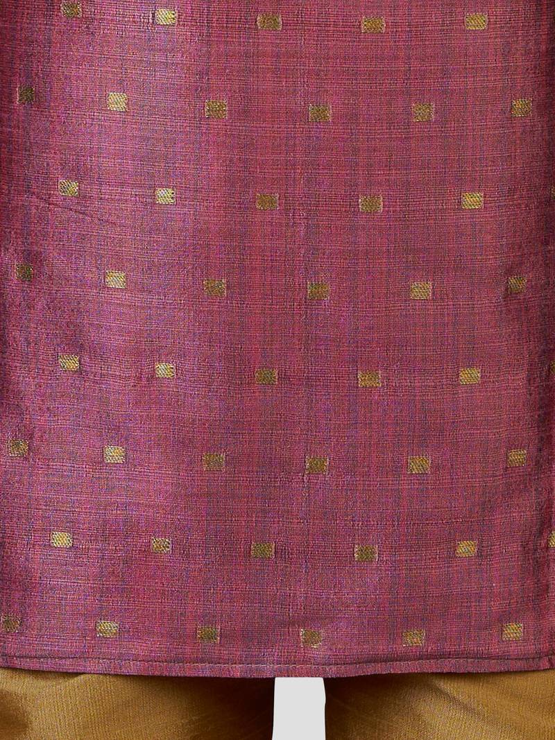 | Product Description | Royal Purple Silk Blend Kurta With Jacquard Weave Paired With Cream Viscose Pyjama. Features Mandarin Collar, Button Closure, And Knee Length Cut. Ideal For Premium Festive Occasions And Traditional Celebrations. |