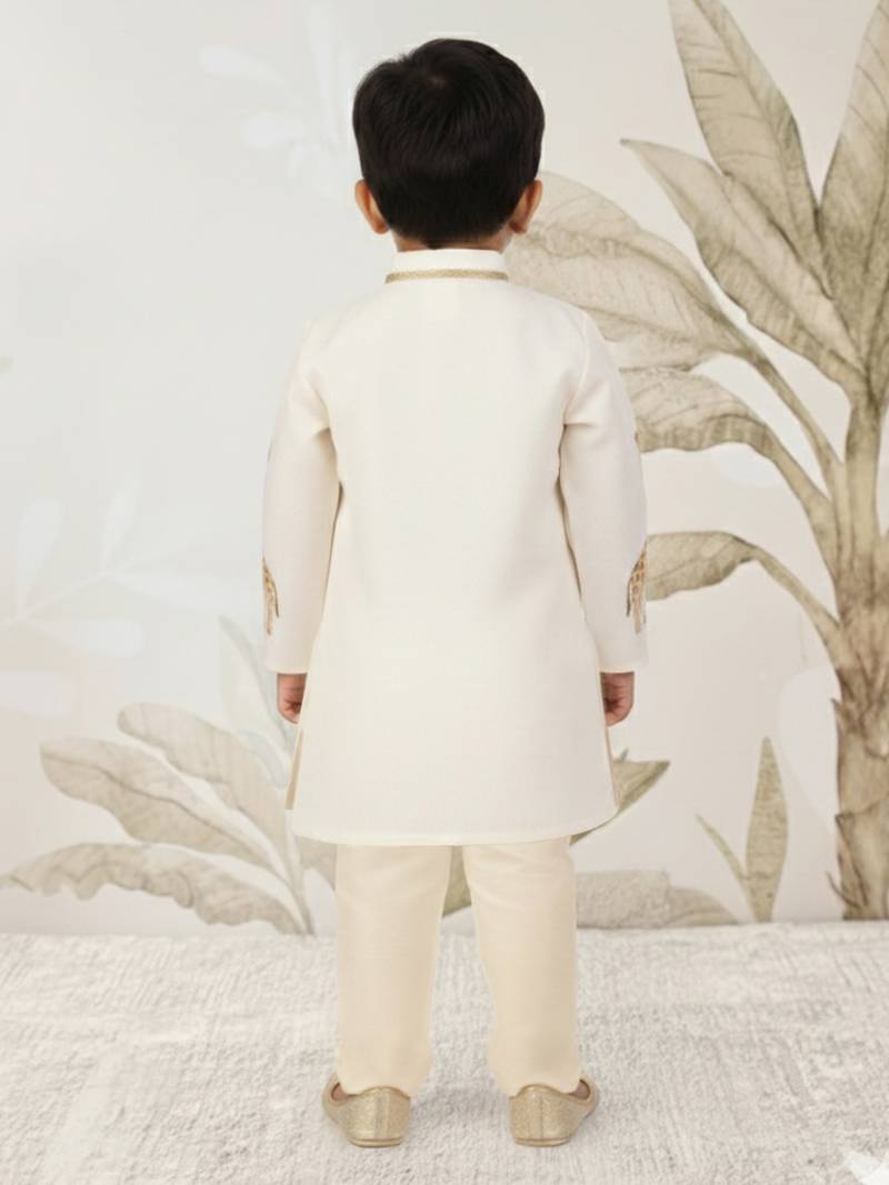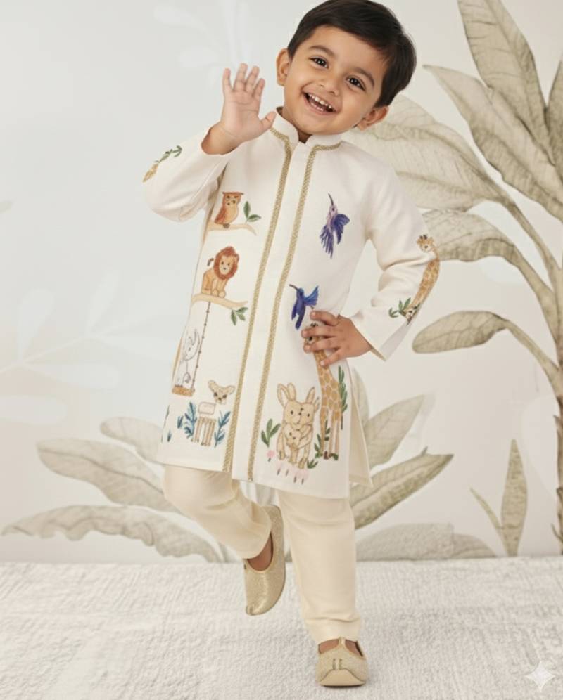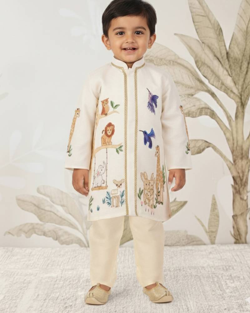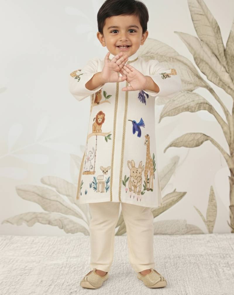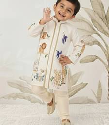 | Product Name | Off White Rayon Animal Print Kurta With Cream Pyjama Festive Set | |