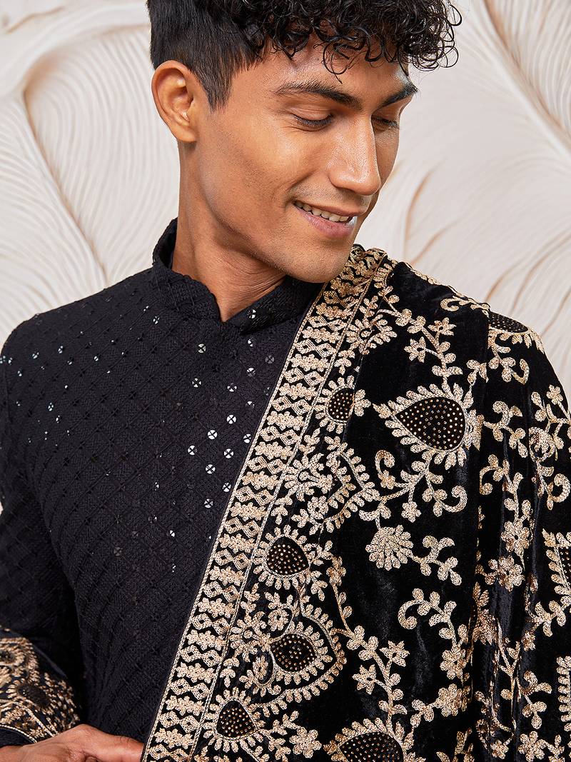 | Product Name | Black Sequin Chikankari Sherwani With Satin Pyjama & Velvet Embroidered Dupatta | Premium Wedding Ensemble | |