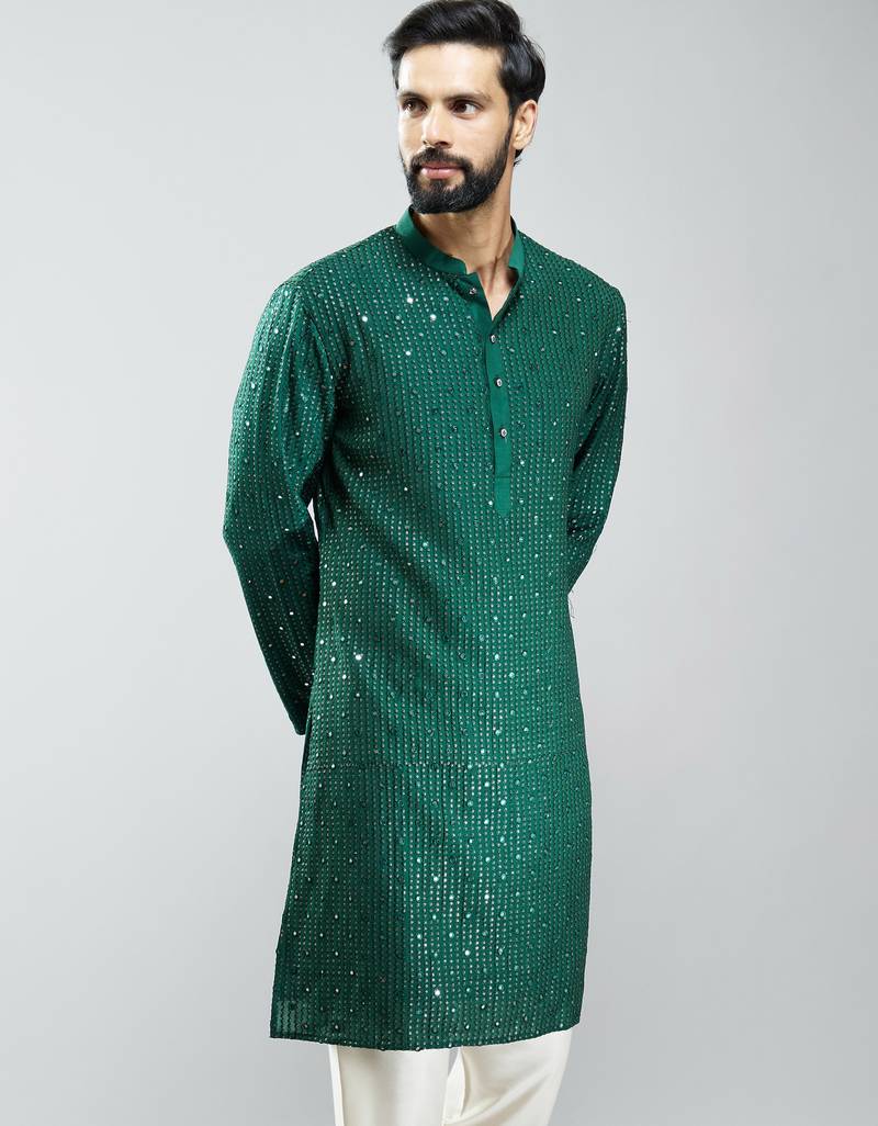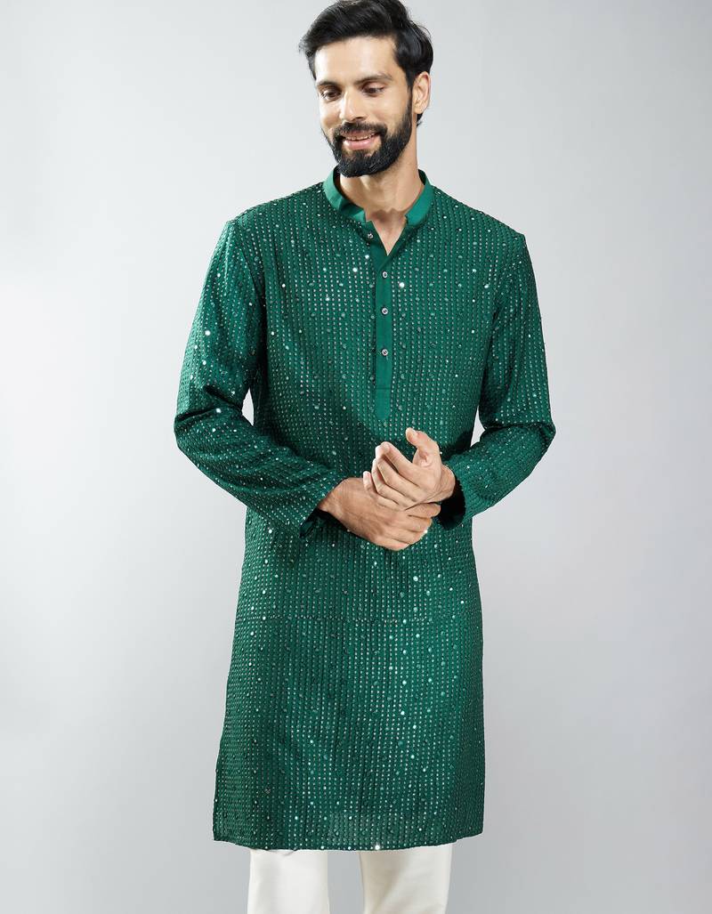 Men bottle green silk blend mirror work long kurta wedding & festive wear