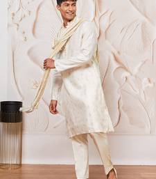 Cream gold jacquard silk blend kurta pyjama set with white crushed dupatta | festive ethnic wear