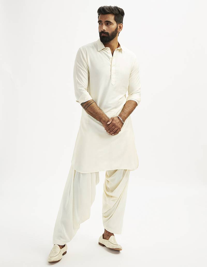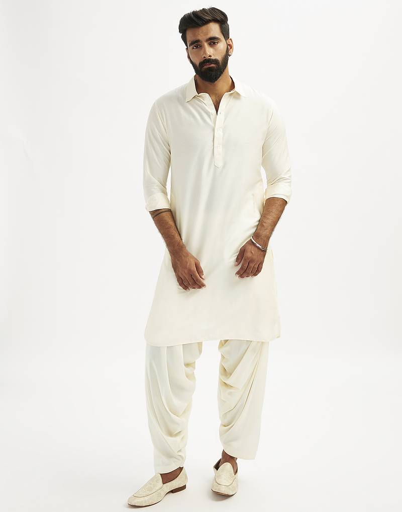 Cream solid pathani kurta and patiala pyjama set | cotton kurta with relaxed fit pyjama