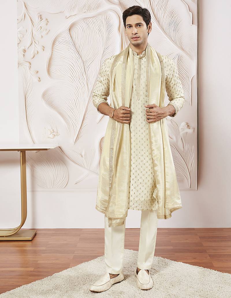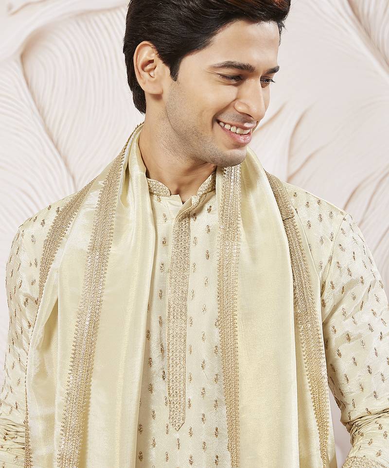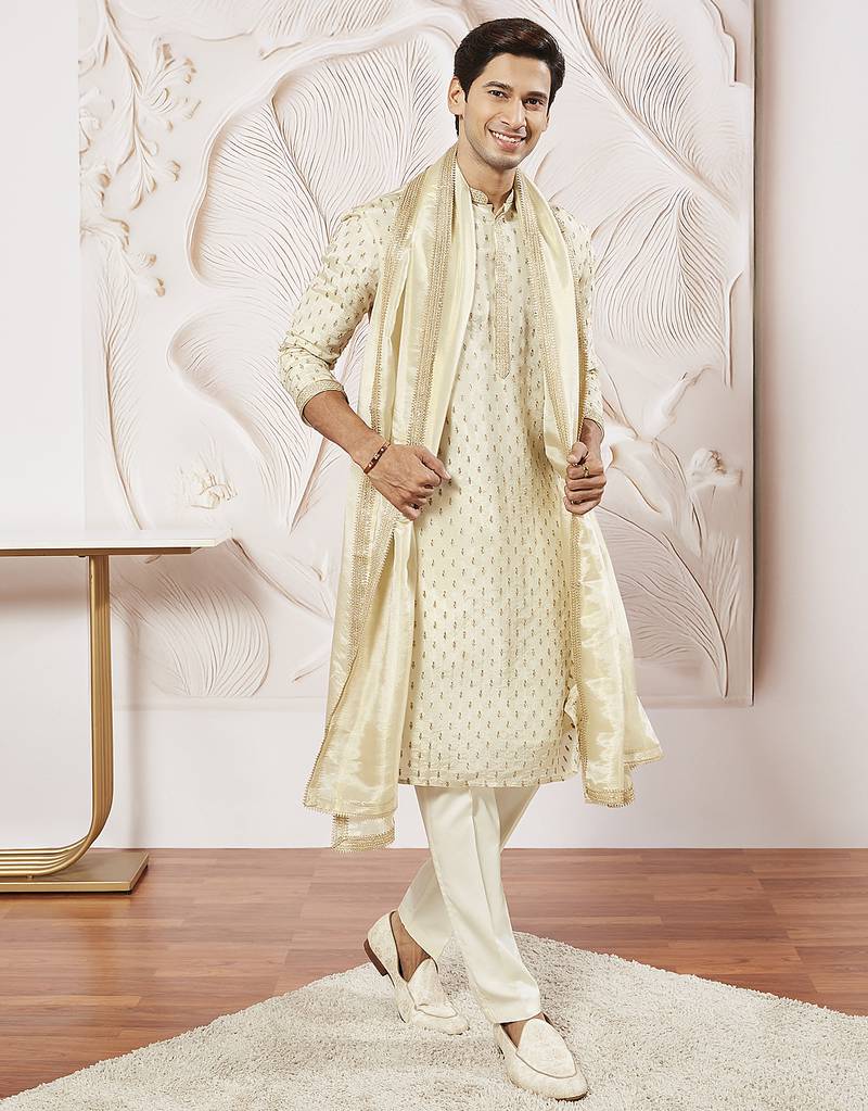 | Product Description | Embrace Regal Luxury With This Premium 3 Piece Tissue Silk Ethnic Ensemble From Vastramay. The Set Showcases A Cream Tissue Silk Long Kurta Featuring Exquisite All Over Zari Embroidery And Sequin Work In Ethnic Motif Pattern That Creates Luminous Shimmer And Opulent Visual Appeal. The Kurta Is Tailored With Mandarin Collar, Button Closure With Concealed Placket For A Refined Sophisticated Appearance, Knee Length Full Sleeve Straight Fit With Side Slits For Comfort, Cotton Lining For Breathable Wear, And 2 Inseam Pockets For Functionality. Complementing The Embellished Kurta Is A Cream Fine Satin Pyjama Featuring Elasticated Waistband With Drawstring Closure For Adjustable Comfort And 2 Inseam Pockets For Convenience. Completing The Ensemble Is A Cream Tissue Silk Dupatta Featuring Elegant 4 Side Lace Border That Adds Refined Traditional Charm, Perfect For Draping Over The Shoulder For Enhanced Elegance. The All Over Zari Embroidery Combined With Sequin Embellishment Creates Sophisticated Glamour And Traditional Elegance While The Tissue Silk Fabric Adds Distinctive Luminous Sheen And Lightweight Luxury. The Fine Satin Pyjama Adds Luxurious Tactile Comfort Perfect For Extended Celebrations. The All Cream Monochrome Palette With Metallic Zari Work And Lace Border Dupatta Ensures Timeless Festive Sophistication And Regal Presence. Ideal For Weddings, Diwali, Navratri, Durga Puja, Eid, Independence Day, Onam, Parties, And Festive Occasions. This Ensemble Combines Traditional Zari Embroidery Craftsmanship With Tissue Silk Luxury And Complete Coordinated Styling. Care Instructions: Dry Clean Only For Kurta And Dupatta; Gentle Hand Wash For Satin Pyjama. |