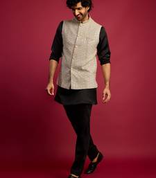 Grey sequin & thread embroidered nehru jacket with black satin kurta & pants set | festive ethnic bundle |