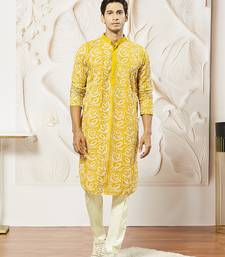 Refresh Your Festive Wardrobe With This Exquisite Ethnic Bundle From Vastramay. The Set Includes A Beautifully Crafted Mustard Fox Georgette Kurta Featuring All Over Chord Embroidery In Delicate Floral Motifs Covering The Entire Fabric. The Knee Length Kurta Is Tailored In A Straight Silhouette With Full Sleeves, Concealed Button Closure, And Side Slits, Lined With Crepe For Added Comfort. Paired With A Cream Fine Satin Pyjama That Offers Supreme Comfort With Its Elasticated Drawstring Waistband And 2 Inseam Pockets For Practicality. The Elaborate Floral Chord Embroidery Combined With The Vibrant Mustard Hue Creates A Sophisticated And Eye Catching Festive Ensemble. Ideal For Weddings, Diwali, Festive Glitz Celebrations, And Party Events, This Kurta Pyjama Set Perfectly Blends Modern Aesthetics With Traditional Embroidery Craftsmanship. Care Instructions: Dry Clean Recommended To Preserve The Chord Embroidery And Georgette Fabric.