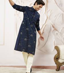 Captivate At Every Celebration With This Premium 2 Piece Embroidered Ethnic Ensemble From Vastramay. The Set Showcases A Navy Blue Silk Blend Long Kurta Featuring Exquisite All Over Sequin And Resham Floral Embroidery That Creates Stunning Visual Richness And Captivating Shimmer. The Kurta Is Tailored With Mandarin Collar, Concealed Closure For A Clean Sophisticated Silhouette, Knee Length Full Sleeve Straight Fit With Side Slits For Comfort, Crepe Lining For Structure And Shape, And Two Inseam Pockets For Functionality. Complementing The Embellished Kurta Is A Cream Fine Satin Pyjama Featuring Elasticated Waistband With Drawstring Closure For Adjustable Comfort And 2 Inseam Pockets For Convenience. The All Over Floral Embroidery Combined With Sequin Embellishment Creates Sophisticated Glamour And Festive Elegance While The Fine Satin Pyjama Adds Luxurious Tactile Comfort. The Navy Blue Cream Color Contrast Delivers Contemporary Ethnic Styling With Timeless Versatility Perfect For Grand Celebrations. The Concealed Closure Ensures A Sleek, Modern Appearance That Stands Out. Ideal For Weddings, Diwali, Navratri, Durga Puja, Eid, Independence Day, Onam, Parties, And Festive Occasions. This Ensemble Combines Traditional Embroidery Craftsmanship With Contemporary Silk Luxury And Sequin Glamour. Care Instructions: Dry Clean Only For Kurta; Gentle Hand Wash For Satin Pyjama.