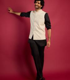 Off-white sequin embroidered nehru jacket with black satin kurta & pants set | contrast festive bundle |