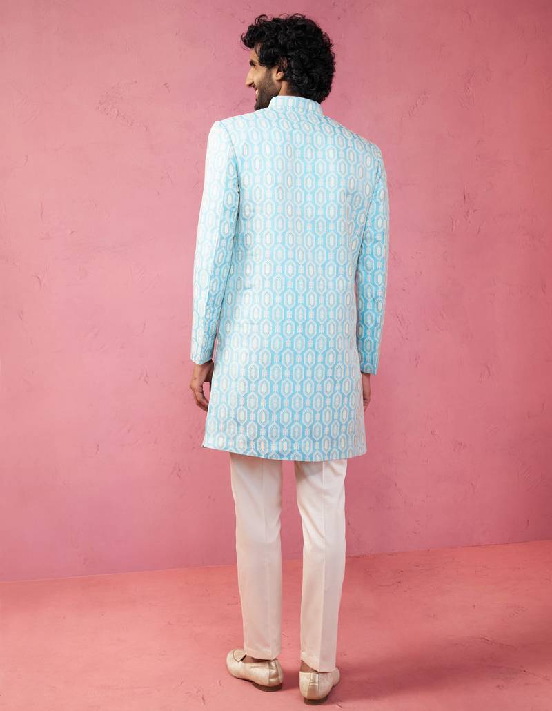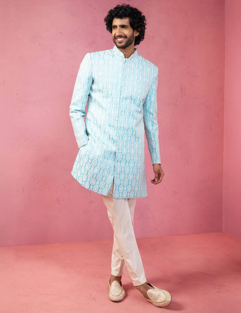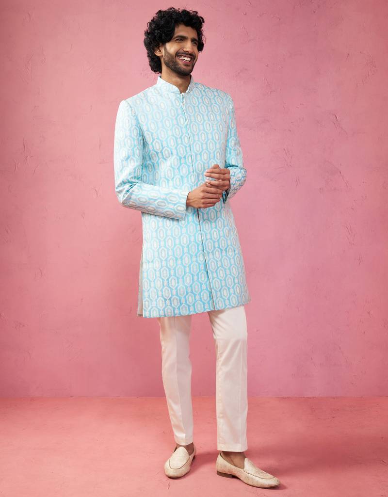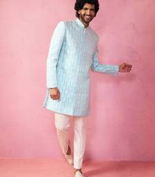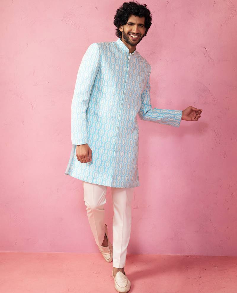 | Product Name | Vastramay Men's Blue Jacquard Indo Western Kurta With Cream Trousers Premium Festive Set | |