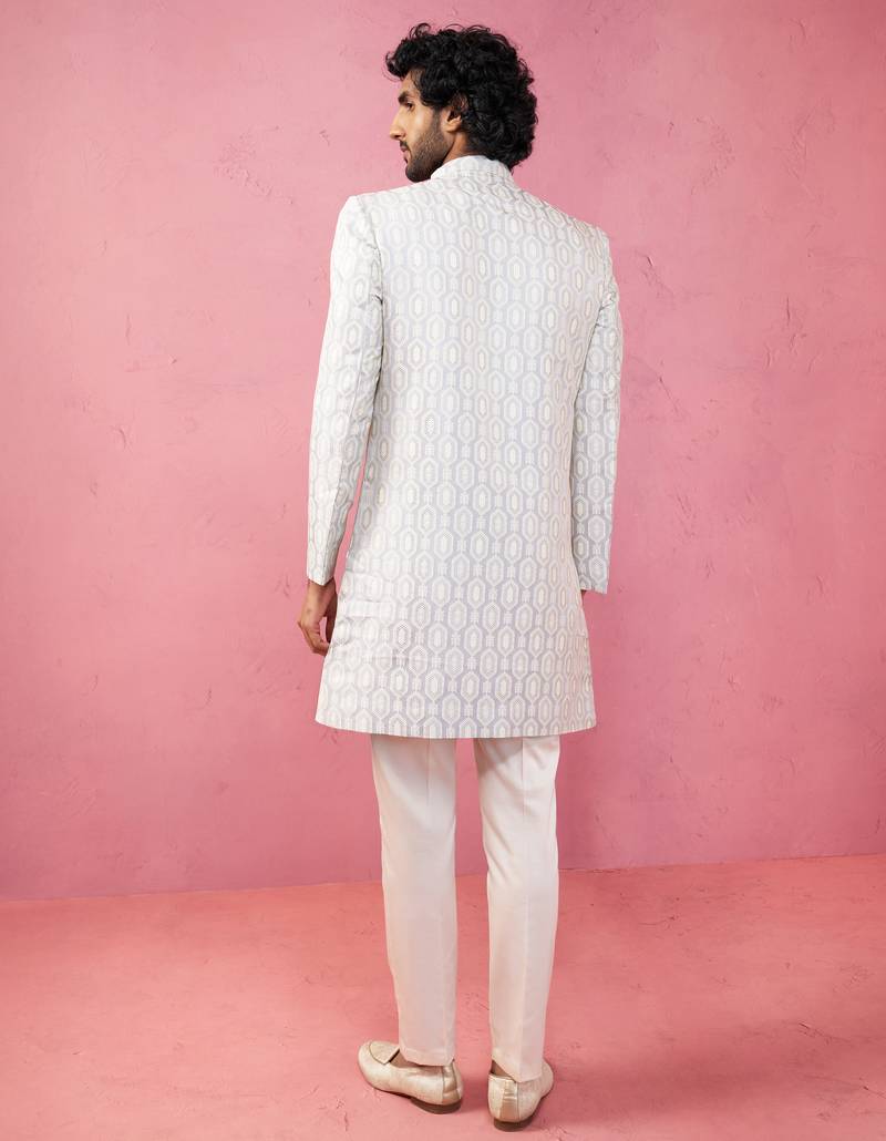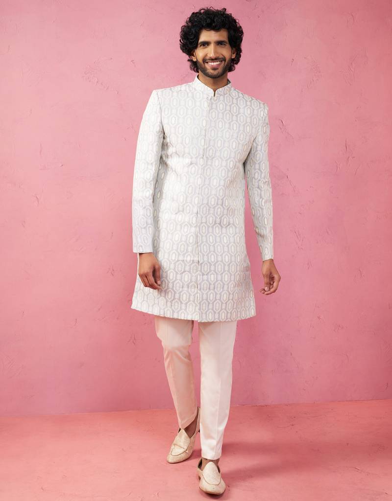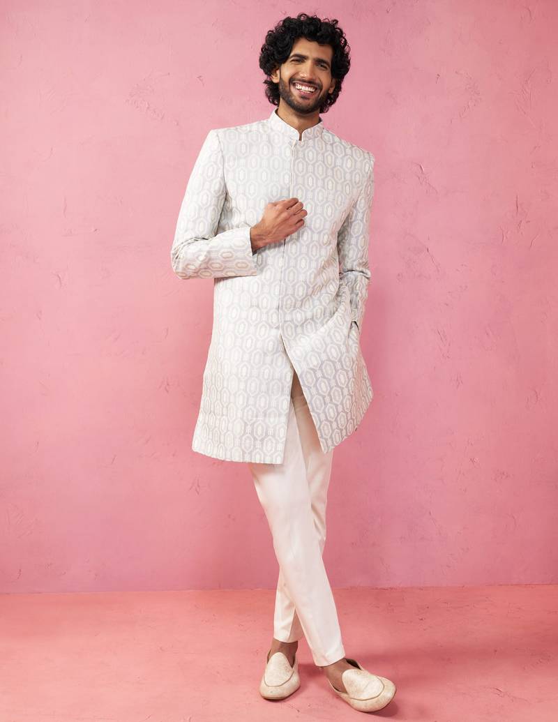 | Product Name | Vastramay Men's Grey Jacquard Indo Western Kurta With Cream Trousers Modern Ethnic Set | |