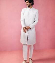 | Product Description | Contemporary Grey Silk Blend Sherwani With Kenzo Jacquard And Floral Patterns, Paired With Cream Satin Pyjama. Features Concealed Closure And Elegant Design For Modern Celebrations. |