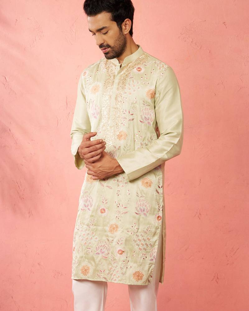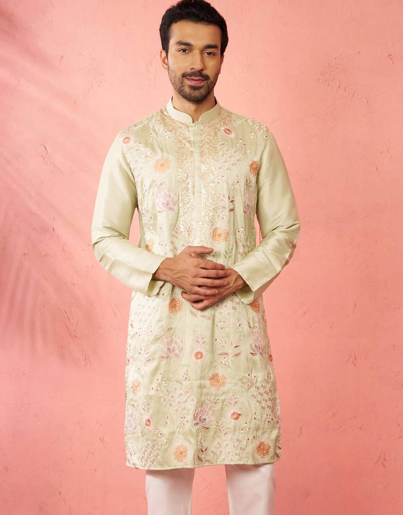 Men's light green silk blend kurta - traditional embroidered festive wear