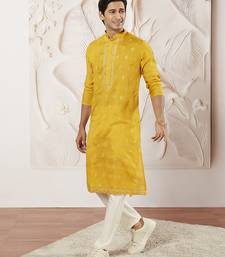 Refresh Your Festive Collection With This Vibrant Ethnic Bundle From Vastramay. The Set Includes A Beautifully Crafted Yellow Fendi Silk Kurta Featuring All Over Thread Embroidery In Traditional Ethnic Motifs Across The Yoke And Entire Body. The Knee Length Kurta Is Tailored In A Straight Silhouette With Full Sleeves, Concealed Button Closure, And Side Slits For Comfort. Paired With A Cream Fine Satin Pyjama That Offers Supreme Comfort With Its Elasticated Drawstring Waistband And 2 Inseam Pockets For Practicality. The Elaborate Embroidery Work Combined With The Rich Yellow Hue Creates A Striking Festive Ensemble. Ideal For Weddings, Diwali, Durga Puja, And Festive Glitz Celebrations, This Kurta Pyjama Set Combines Traditional Artistry With Contemporary Appeal. Care Instructions: Dry Clean Recommended To Preserve The Intricate Embroidery And Silk Fabric.