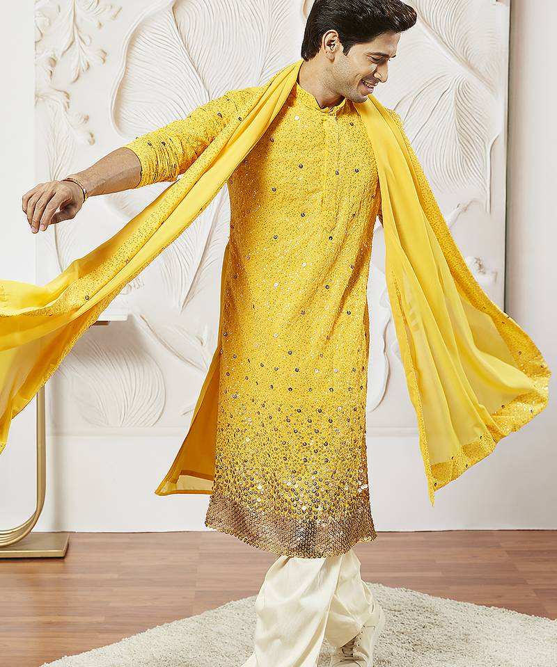 Yellow georgette sequin embroidered dupatta | festive & wedding wear with fabric border