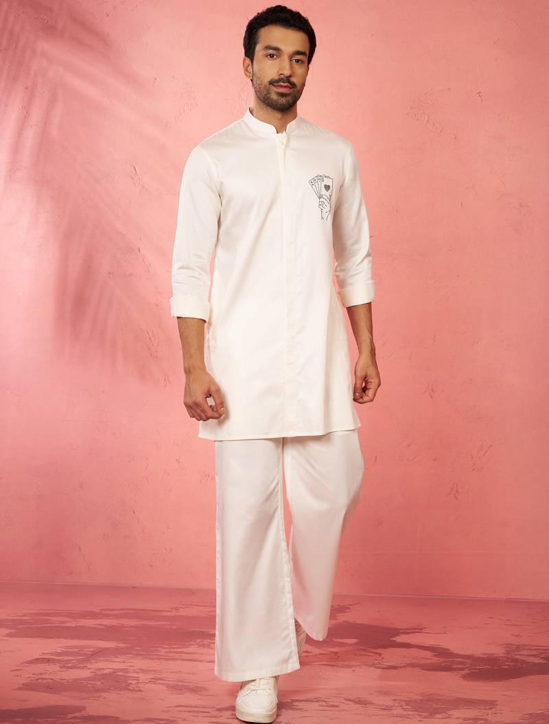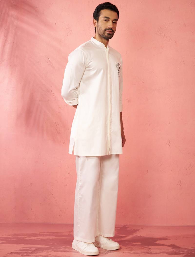 | Product Description | Embrace Festive Elegance With Vastramay's Pristine White Fine Satin Kurta Featuring Delicate Stone Work Embellishments. The Thigh Length Kurta With Stone Embroidery On Right Chest And Cuffs, Complemented By Cream Flare Pant Creates A Refined Look Perfect For Diwali And Special Celebrations. | |