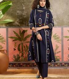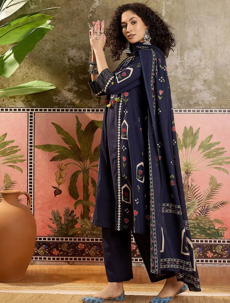 | Product Description | Blue A Line Calf Length Kurta Has A Round Neck Three Quarter Regular Slevees, Solid Trousers,Elasticated Waistband, Slip On Closure, Has A Pocket, Printed Dupatta, Has A Taping Border. |