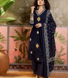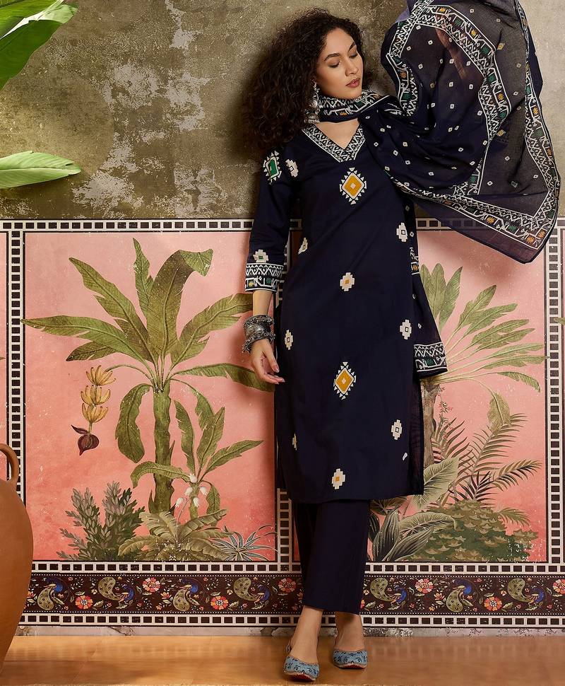| Product Description | Blue Straight Calf Length Kurta Has A V Neck Three Quarter Regular Slevees, Solid Trousers,Elasticated Waistband, Slip On Closure, Has A Pocket, Printed Dupatta, Has A Taping Border. |