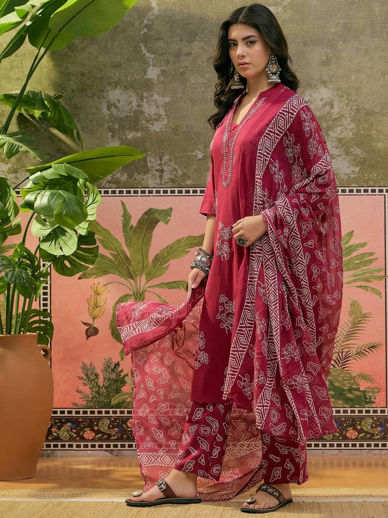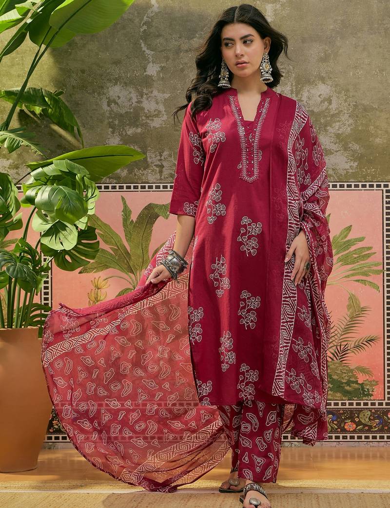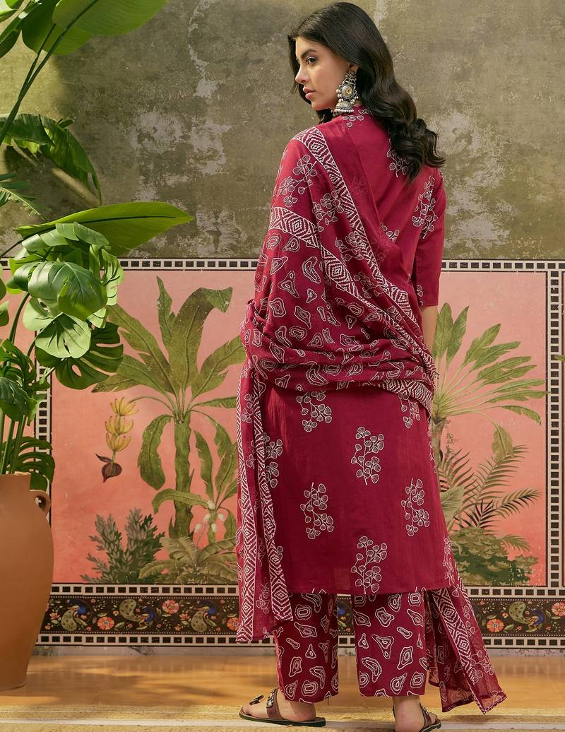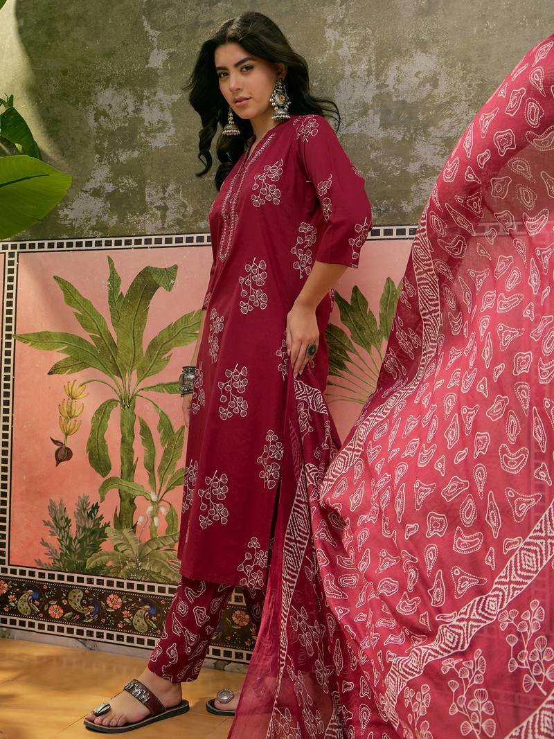 Maroon printed kurta with trousers & dupatta set
