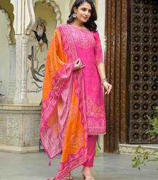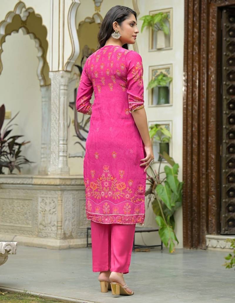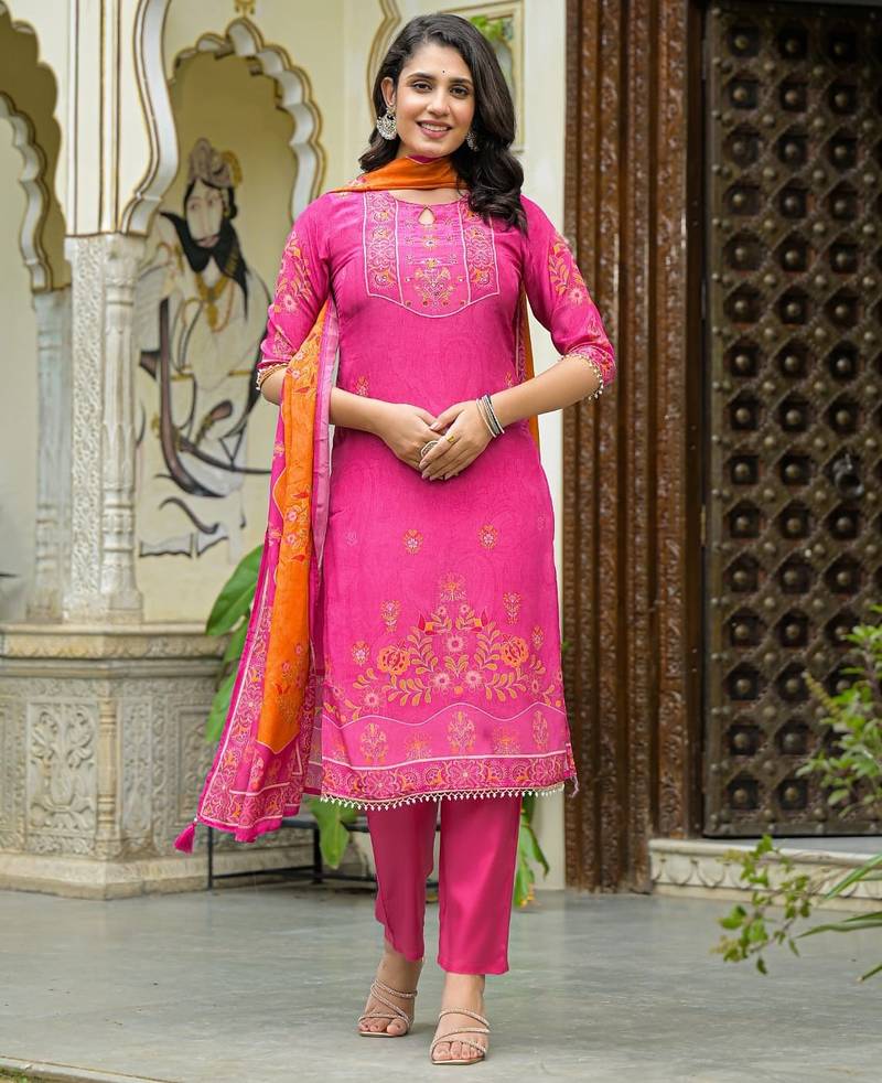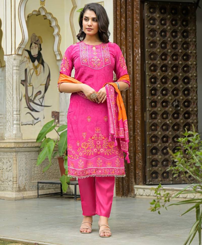 | Product Description | Peach Color Printed Kurta With Trousers & Dupatta, Straight Calf Length Kurta & Straight Hem, Has A Keyhole Neck , Three Quarter Regular Slevees,