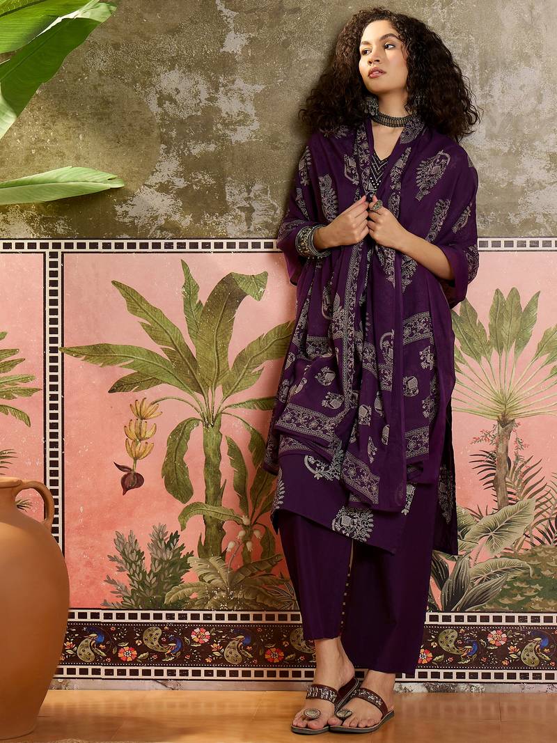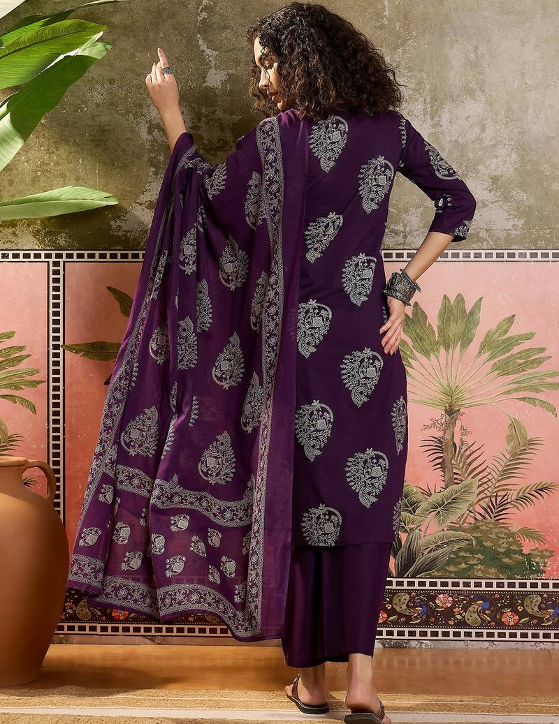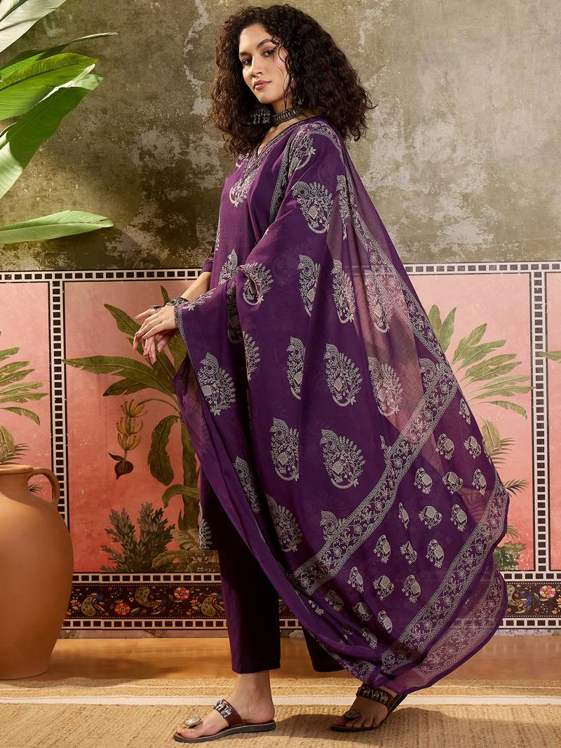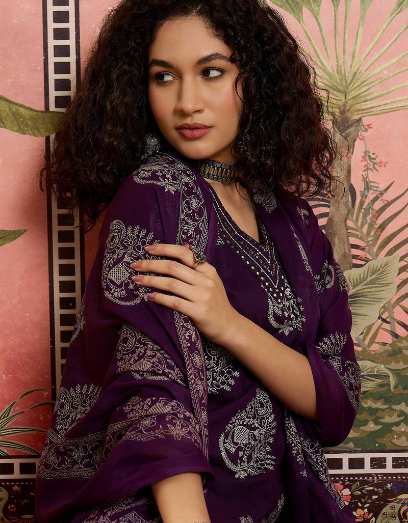 Purple printed kurta with trousers & dupatta set