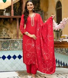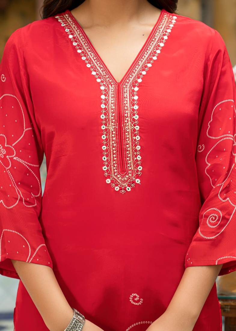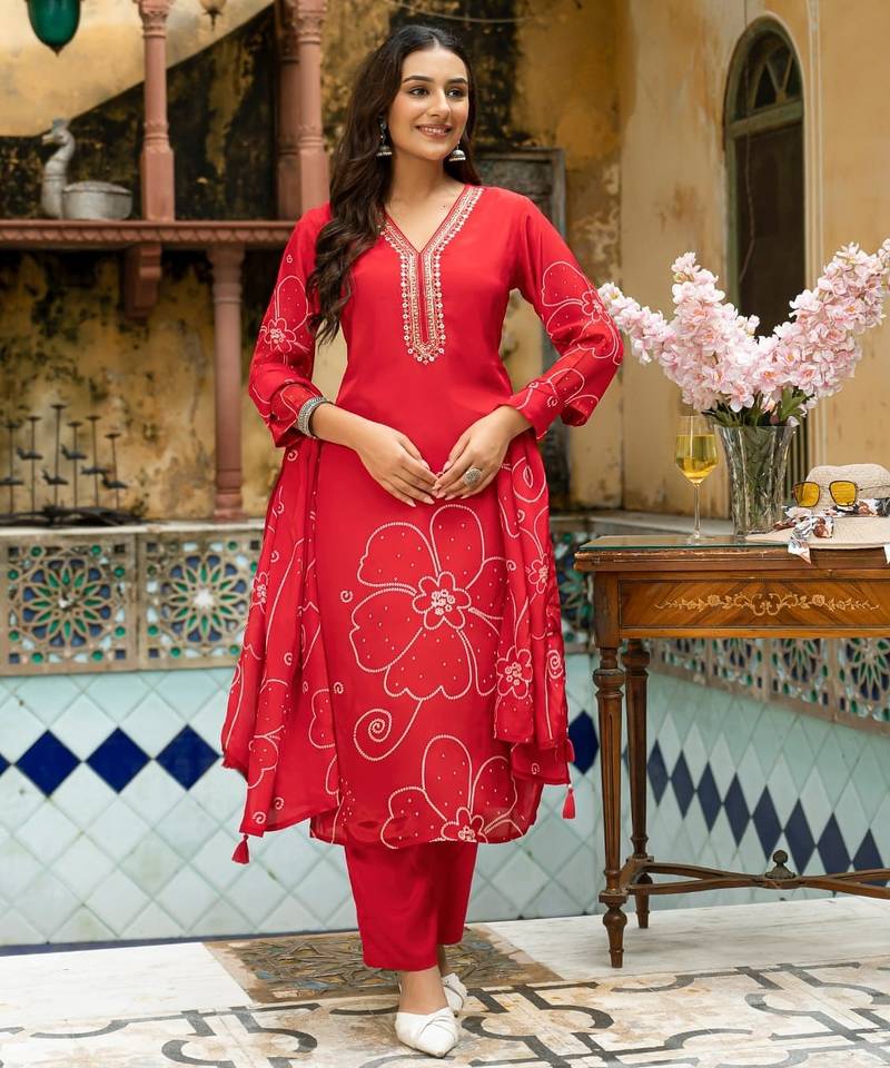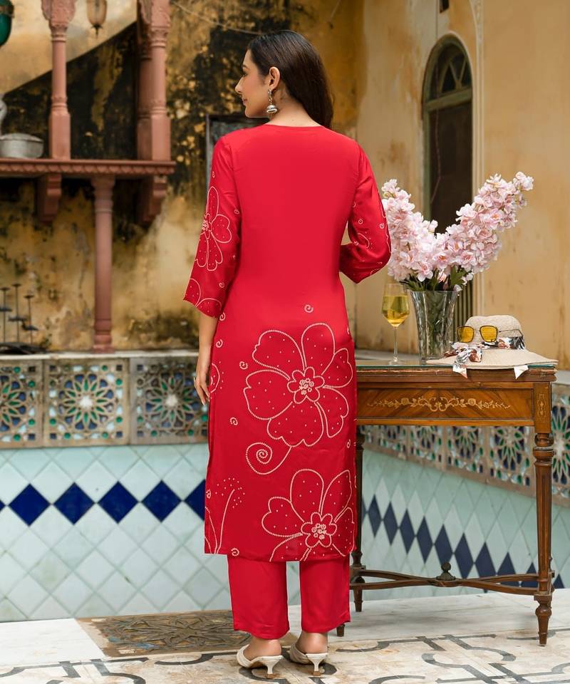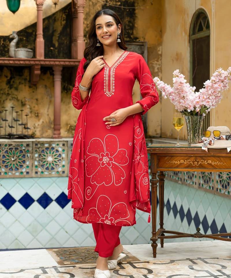 | Product Description | Red Color Digital Printed Kurta With Trousers & Dupatta, Straight Calf Length Kurta & Straight Hem, Has A V Neck, Three Quarter Regular Slevees,