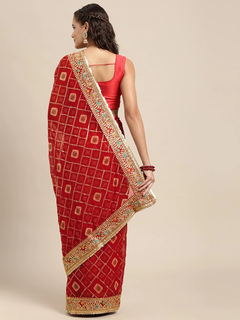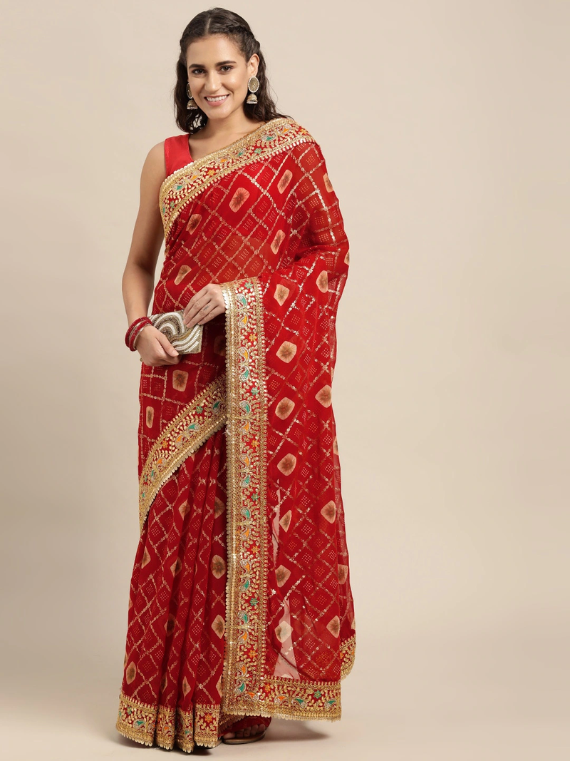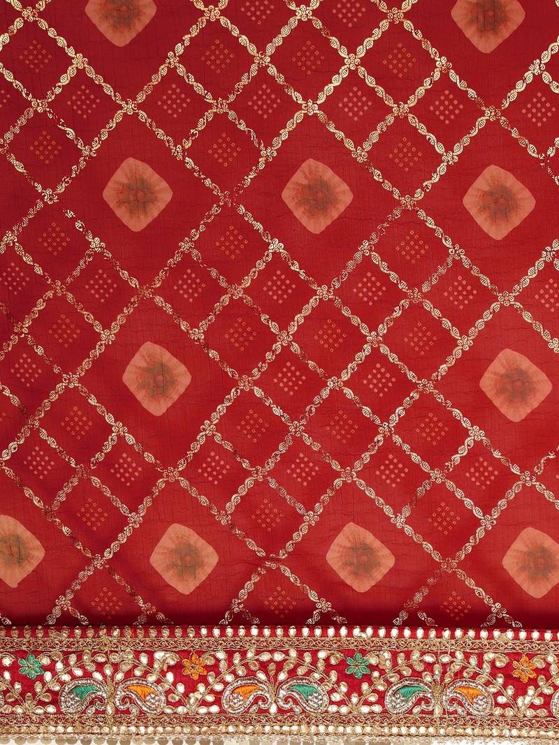 | Product Description | Red And Golden Bandhani Saree Bandhani Printed Saree With Embellished Border Has Sequinned Detail |