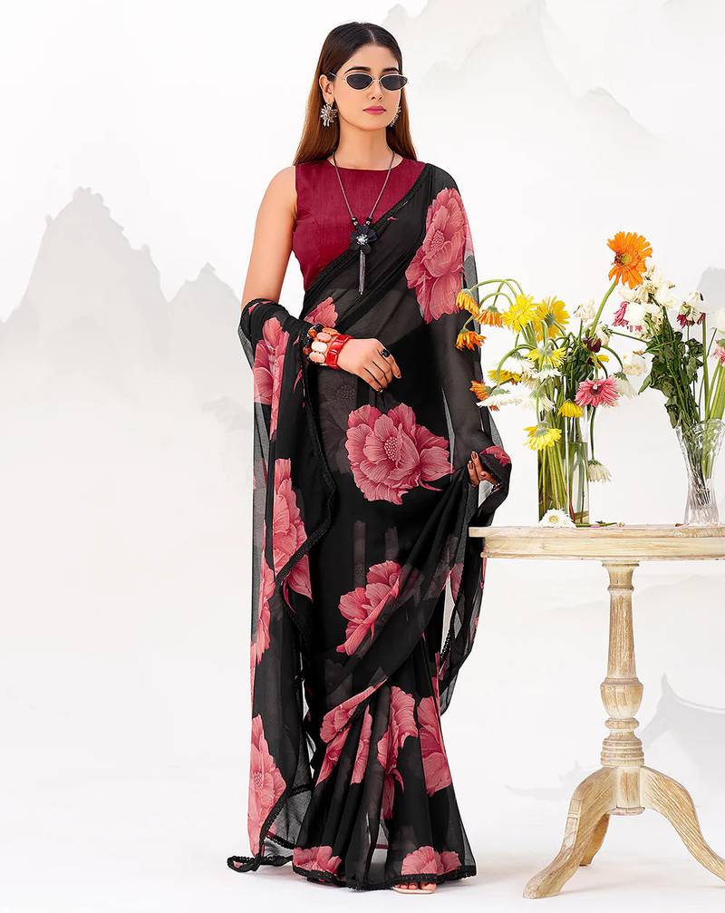 Black floral print with lace border work chiffon saree & unstitched blouse