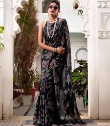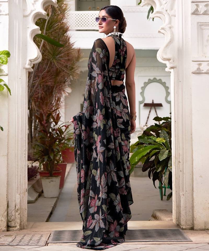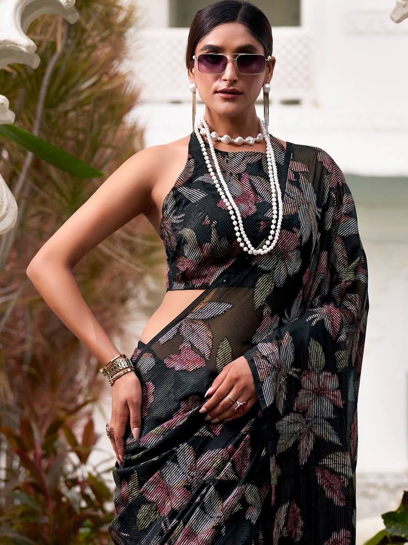 Black lurex brasso floral printed saree with unstitched blouse