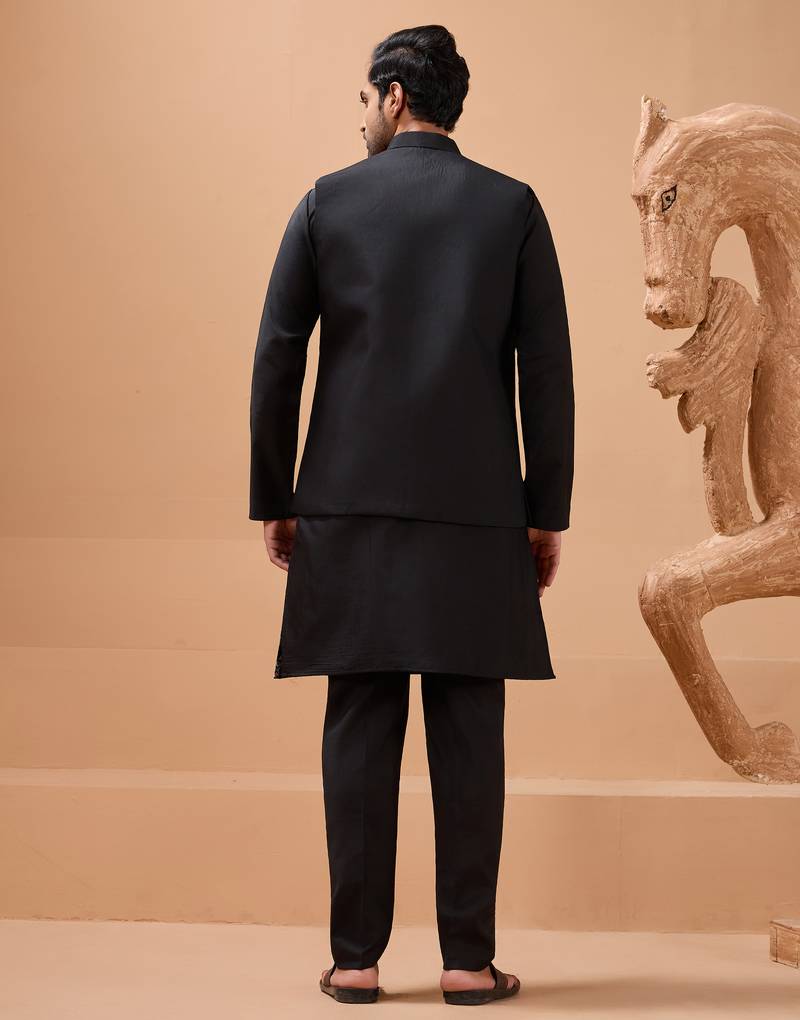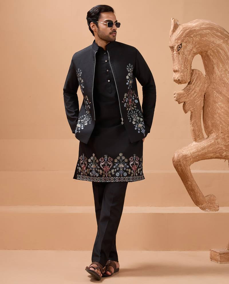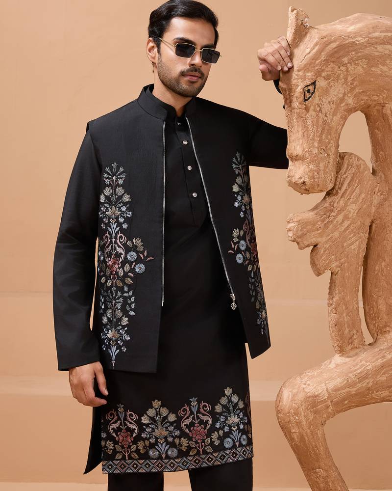| Product Name | Black Viscose Silk Multi Thread With Sequence Embroidered Work Kurta Jacket & Bottom | |