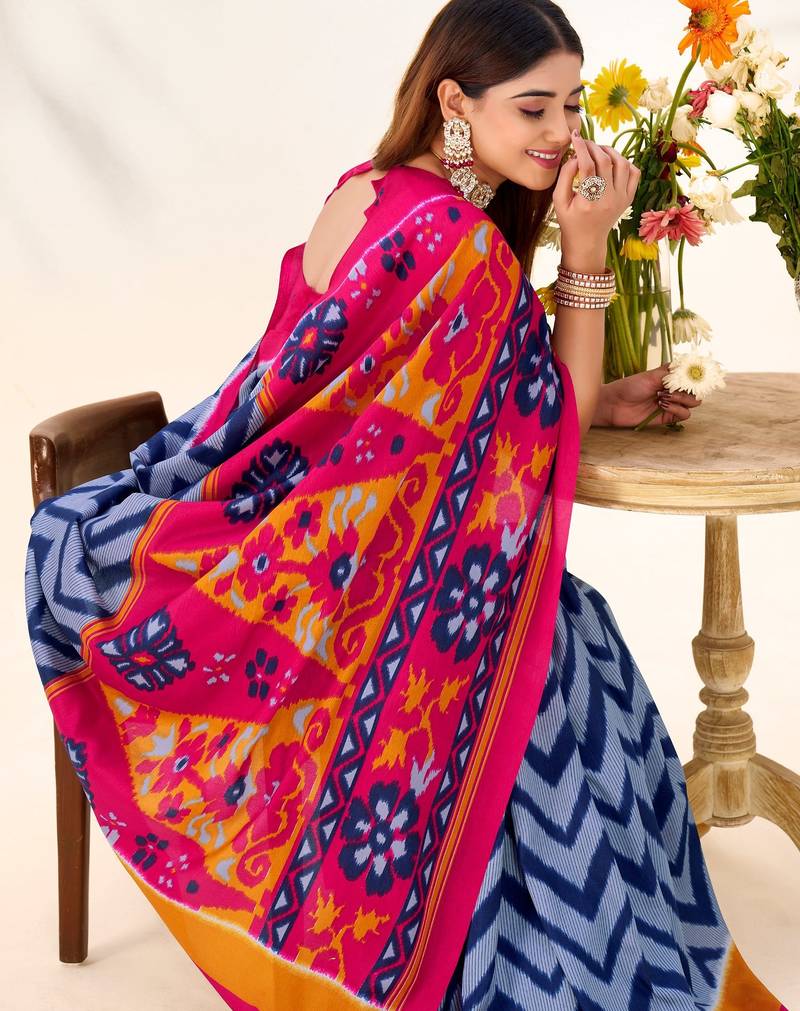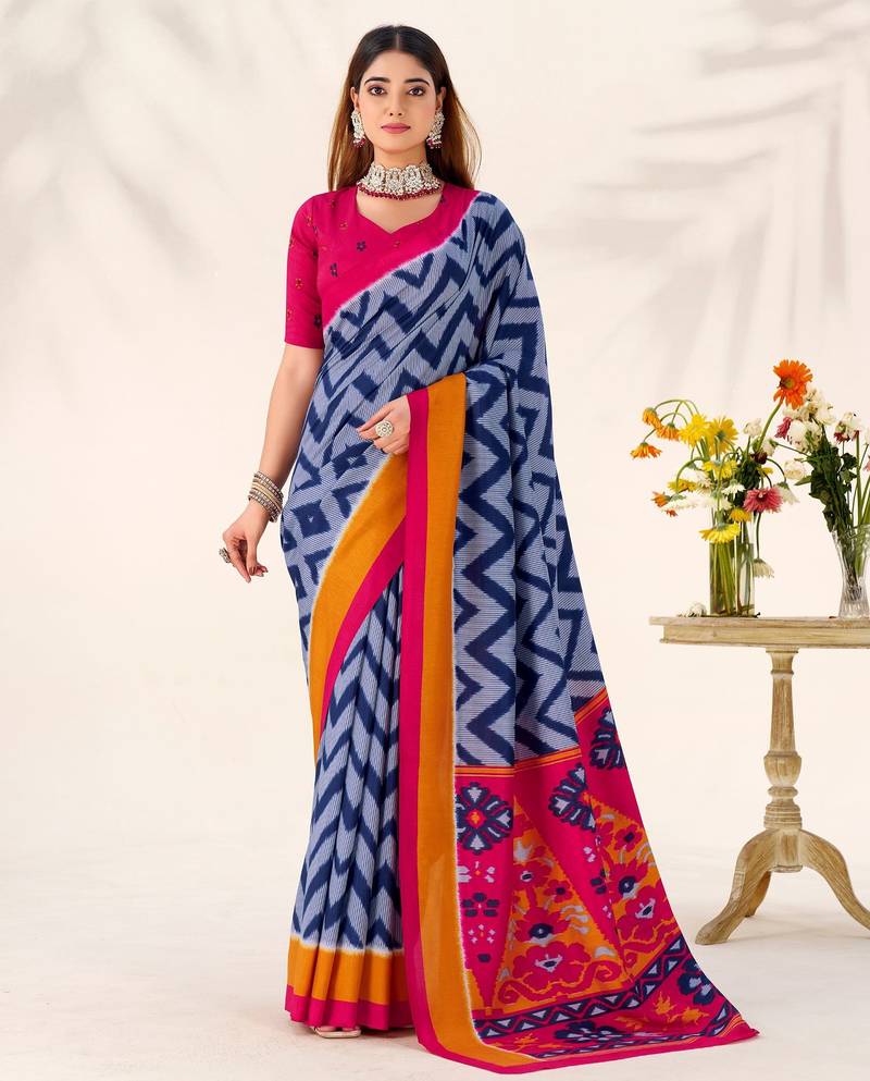 Blue tussar silk zigzag waves printed saree with unstitched blouse