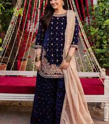 Blue viscose velvet intricate thread & sequence with peral work top plazzo with dupatta stitched