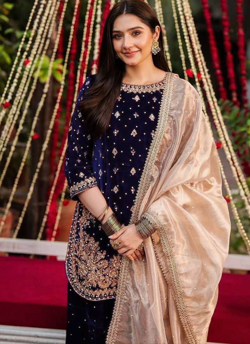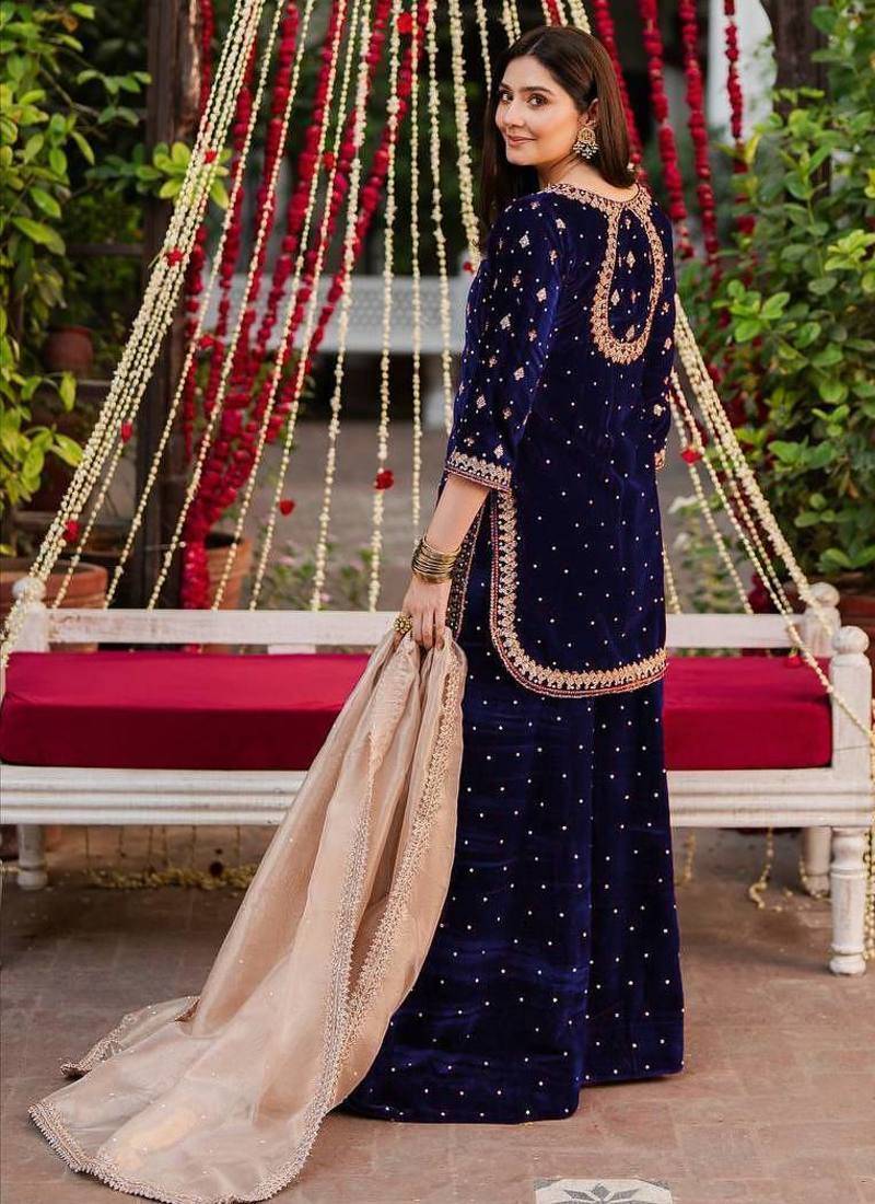 | Product Name | Blue Viscose Velvet Intricate Thread & Sequence With Peral Work Top Plazzo With Dupatta | |