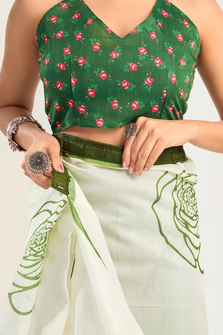 Green digital printed linen ready to wear designer saree with unstitched blouse