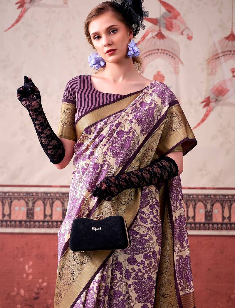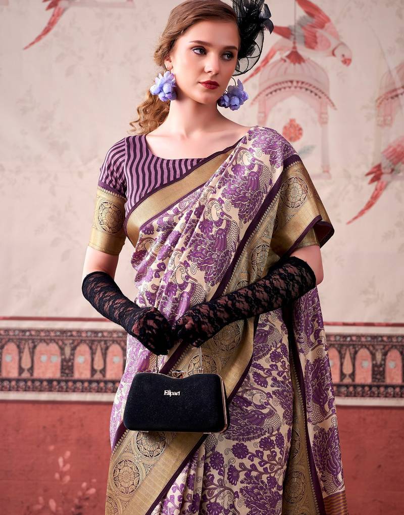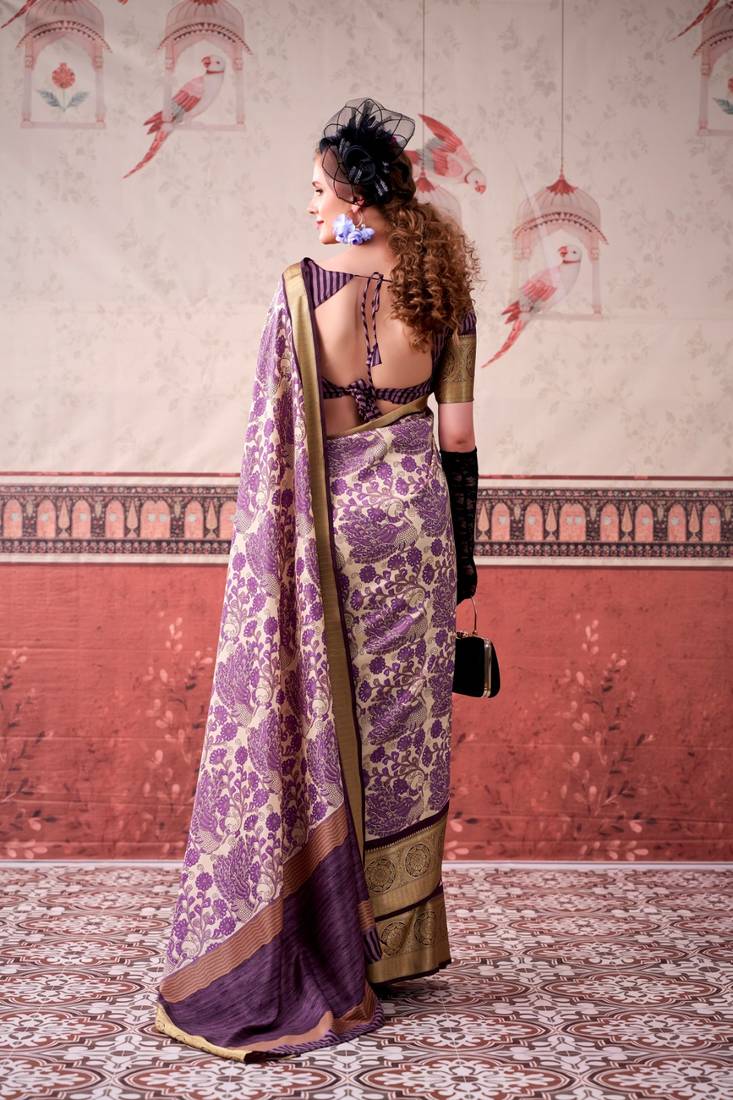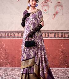 Lavender tussa silk printed with viscose border saree & unstitched blouse