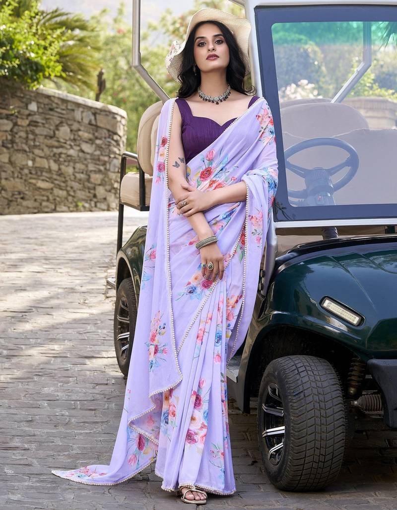 | Product Name | Lavender Marbal Printed Pearl Border Saree With Unstitched Blouse | |