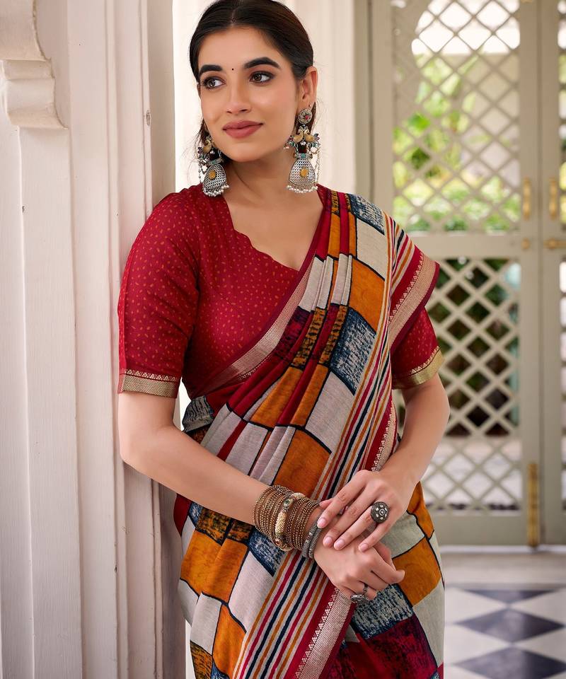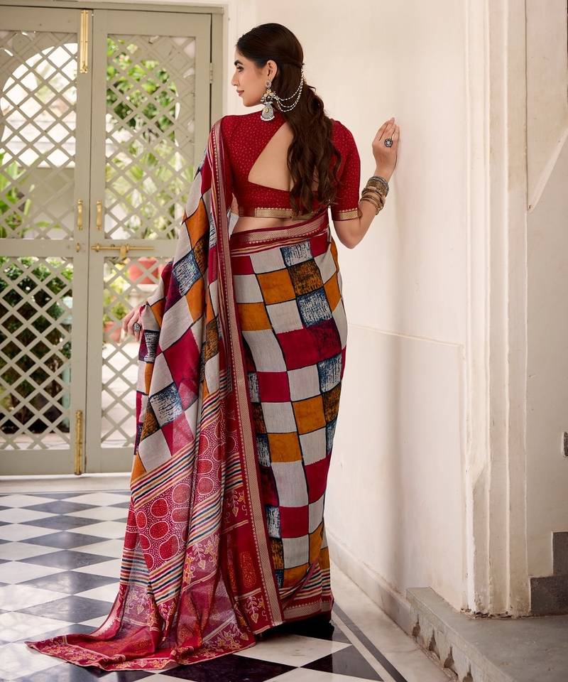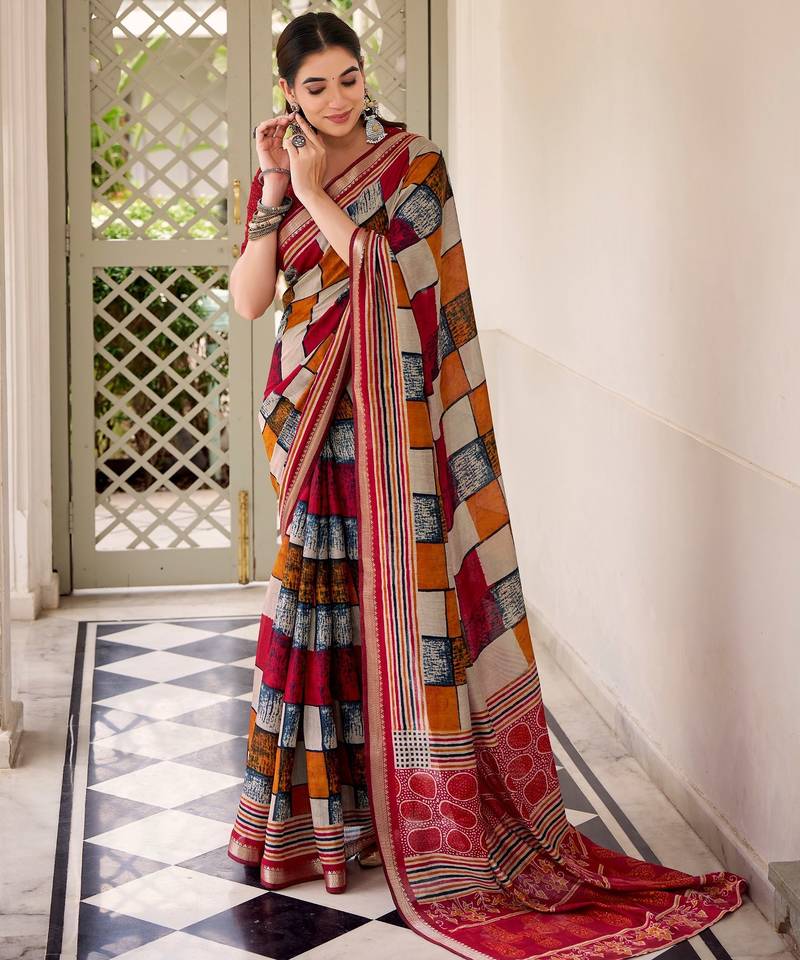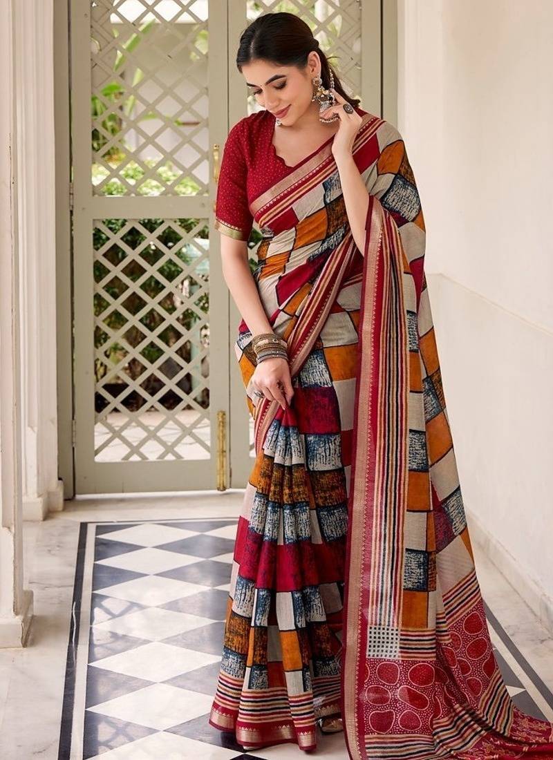 | Product Name | Maroon Viscose Chanderi Printed With Temple Border Saree & Unstitched Blouse | |
