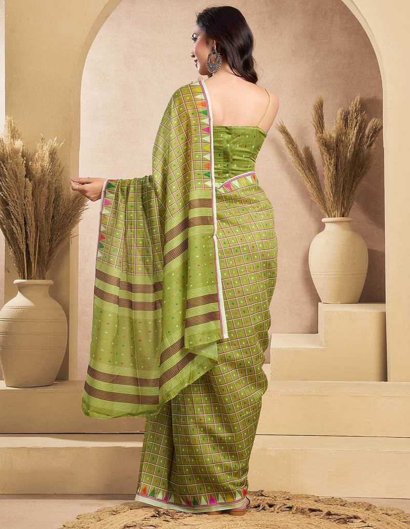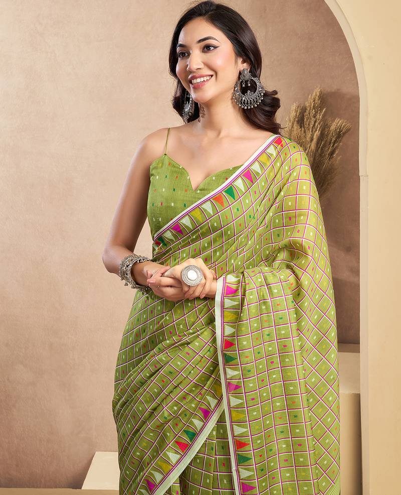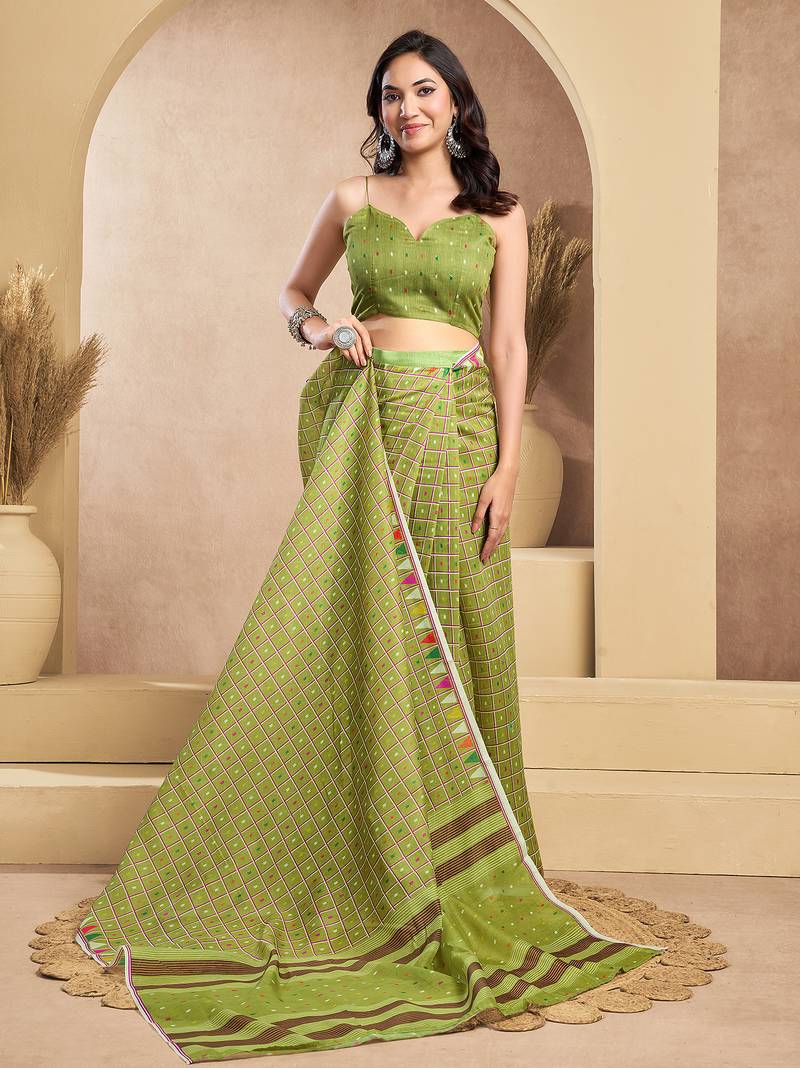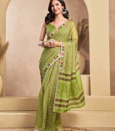 Mehendi digital printed linen ready to wear designer saree with unstitched blouse