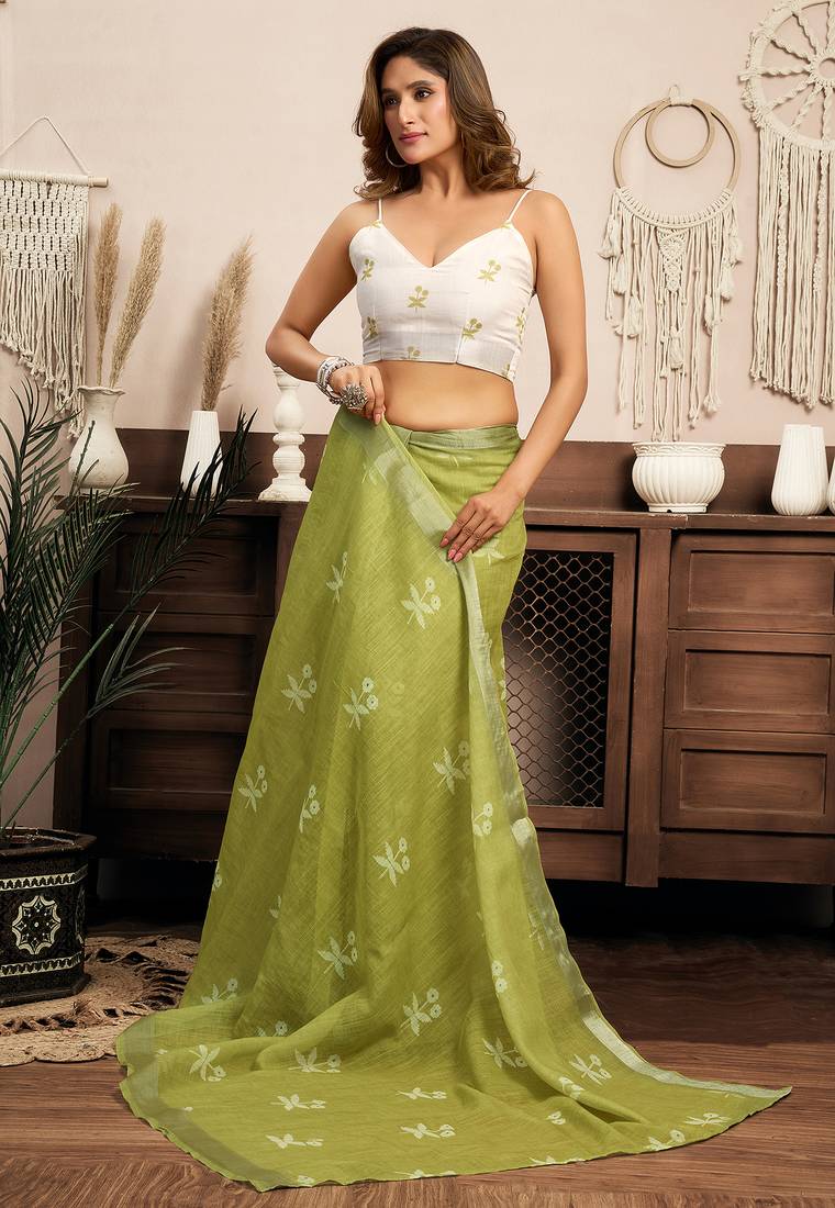 Mehendi digital printed linen ready to wear designer saree with unstitched blouse