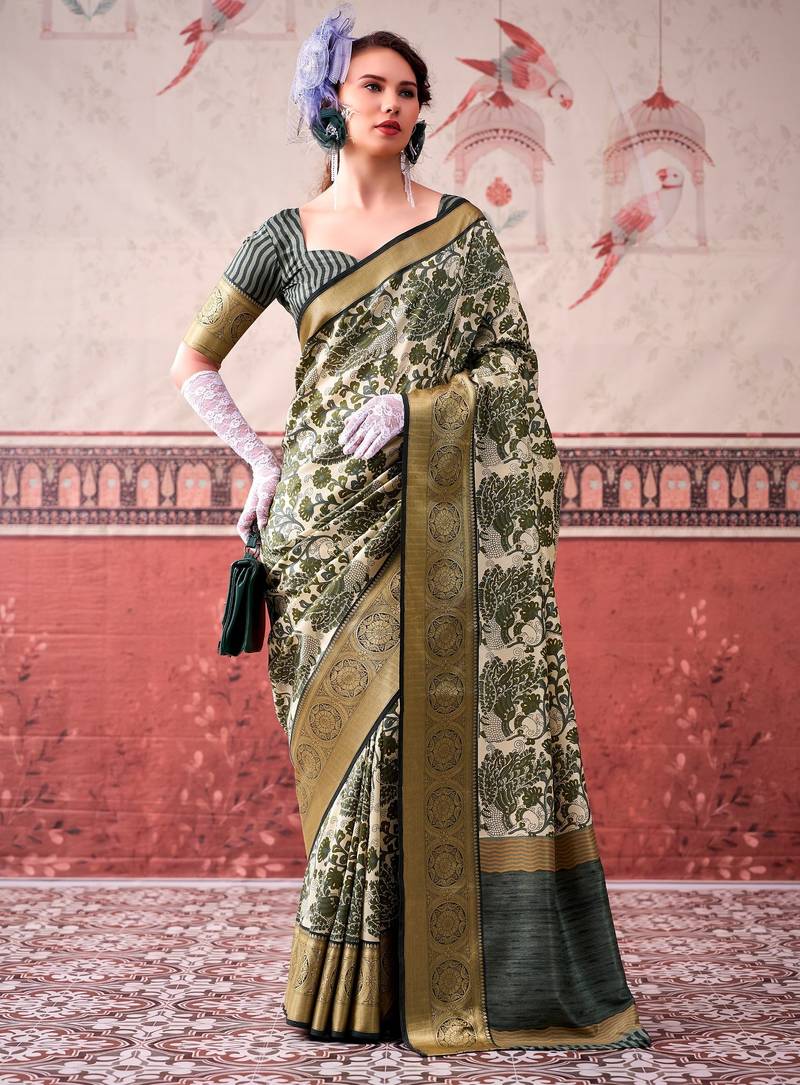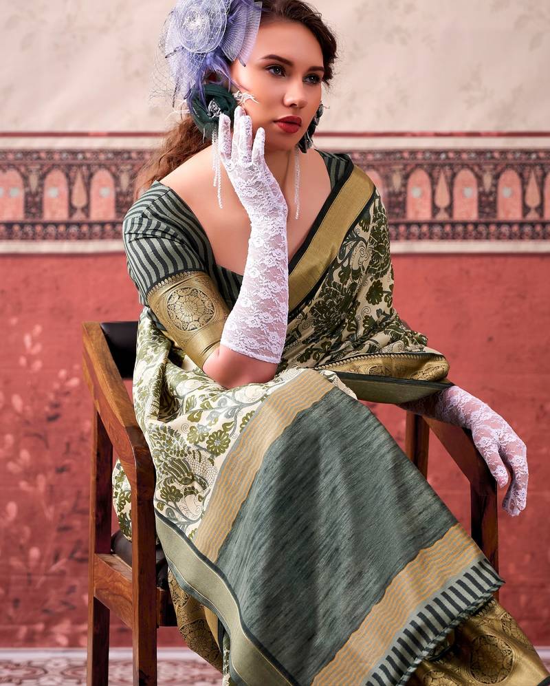 Product Name Mehendi Tussa Silk Printed With Viscose Border Saree & Unstitched Blouse