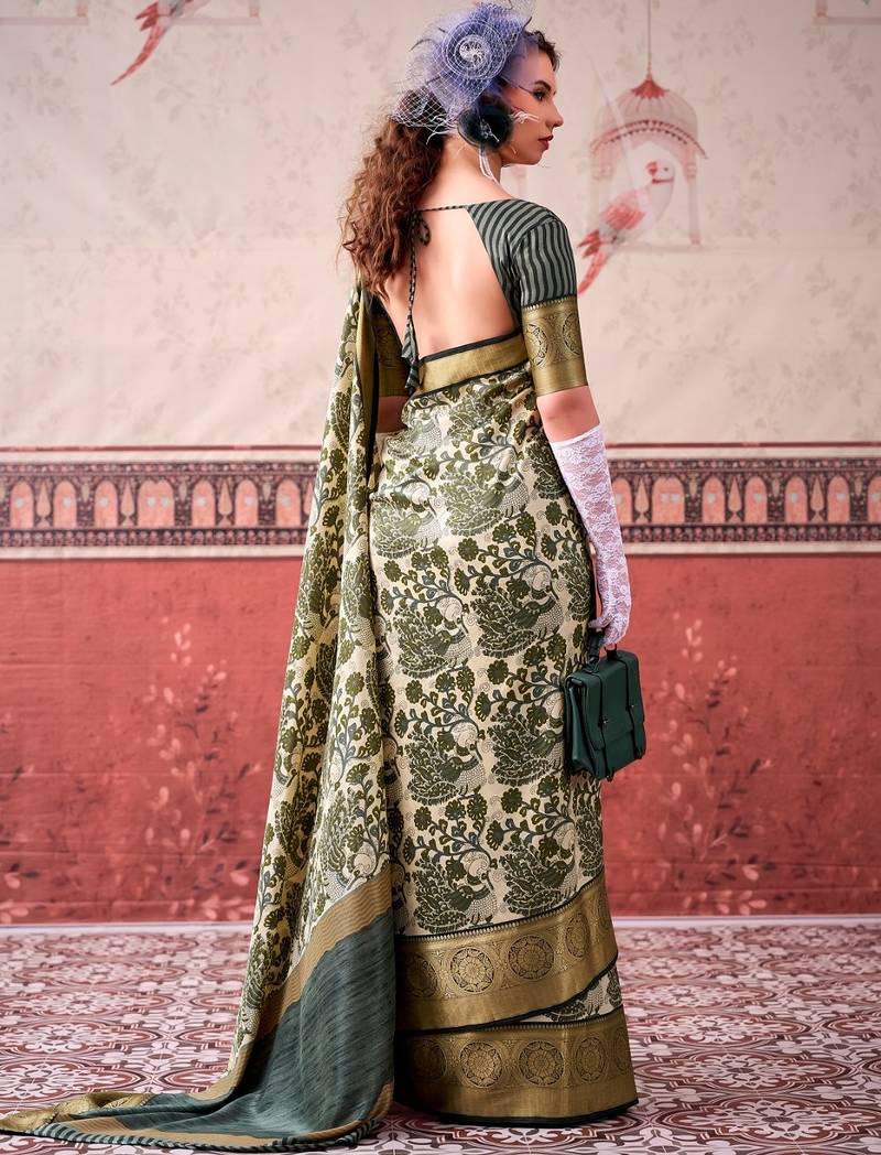 Mehendi tussa silk printed with viscose border saree & unstitched blouse