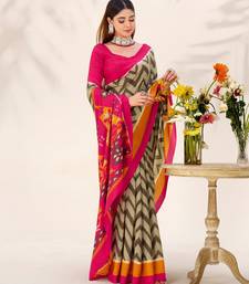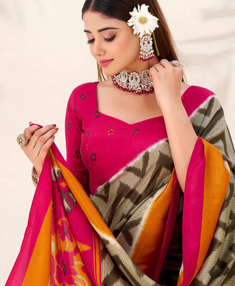 Mehendi tussar silk zigzag waves printed saree with unstitched blouse