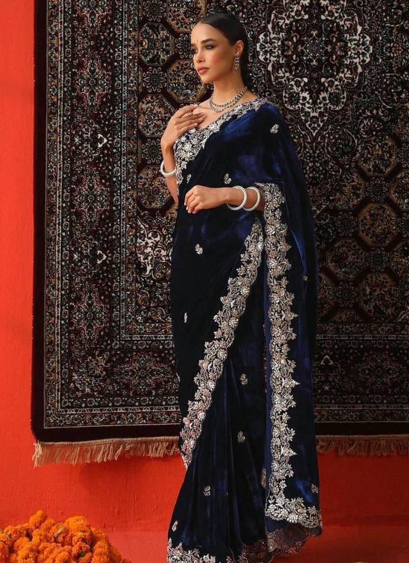 | Product Description | A Navy Blue Velvet Saree With A Embroidered Border Featuring Zardozi And Sequins, Along With Floral Placement Buttis. It Is Paired With A Petticoat And A Bustier Style Blouse Adorned With All Over Floral Jaal Work. Blouse Infe