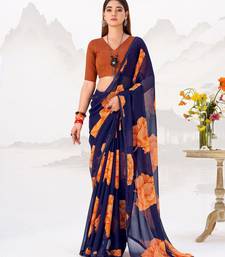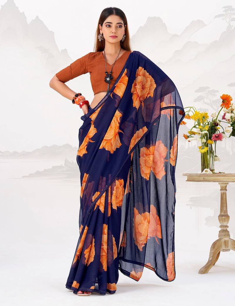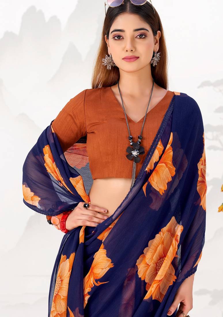 Navy nlue floral print with lace border work chiffon saree & unstitched blouse