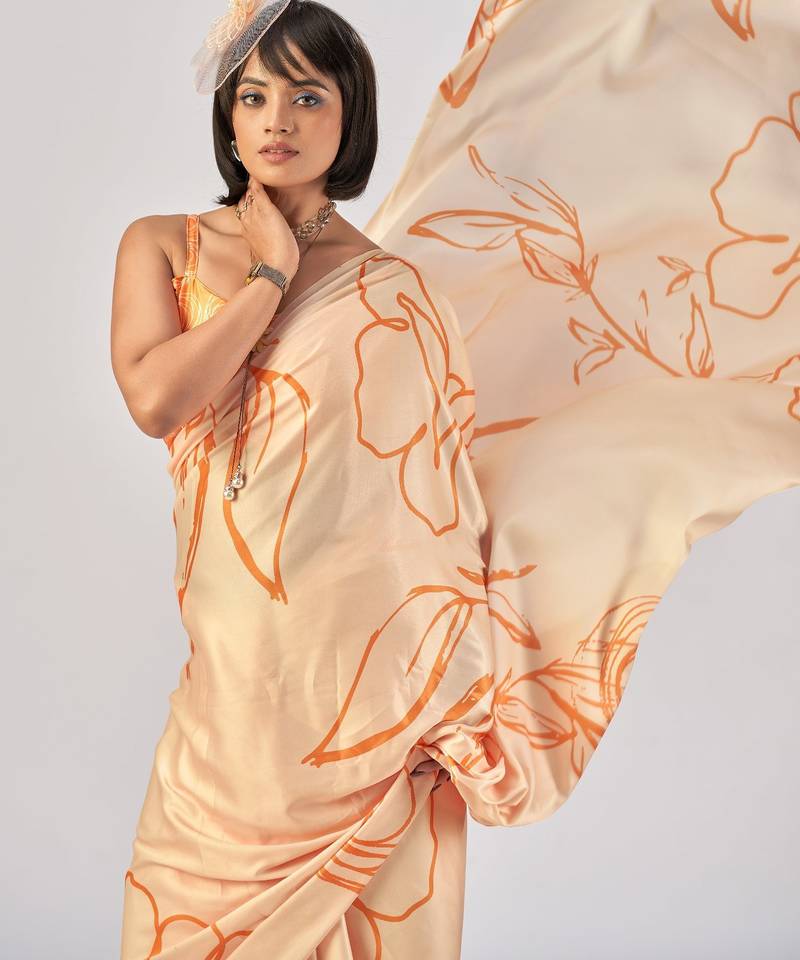 Product Name Orange Satin Silk Elegant Printed Saree With Unstitched Blouse