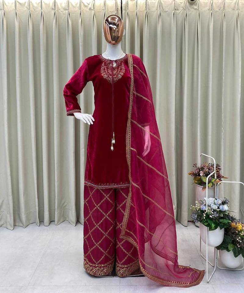 | Product Description | Traditional Velvet Designer Embroidery Work Wear Kurta Bottom Pair With Dupatta Fabric Details :